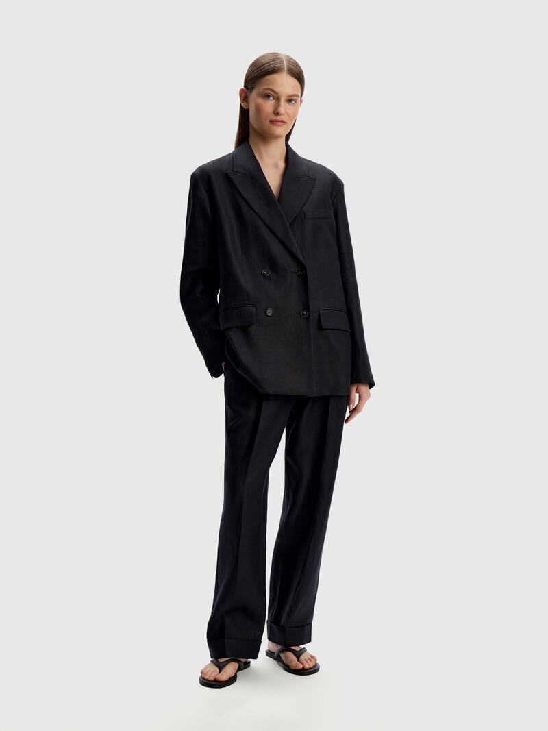 Брюки из плотного мягкого льна — наш летний бестселлер. Слегка зауженные, со складками и стрелками, они подойдут и для вечера, и для повседневных образов, а черный цвет оттенит загорелую кожу. European Flax — сертифицированный европейский лен высшего качества: помогает сократить глобальный углеродный след, безопасен для человека и становится лучше с каждой стиркой. Сделано в Китае.
