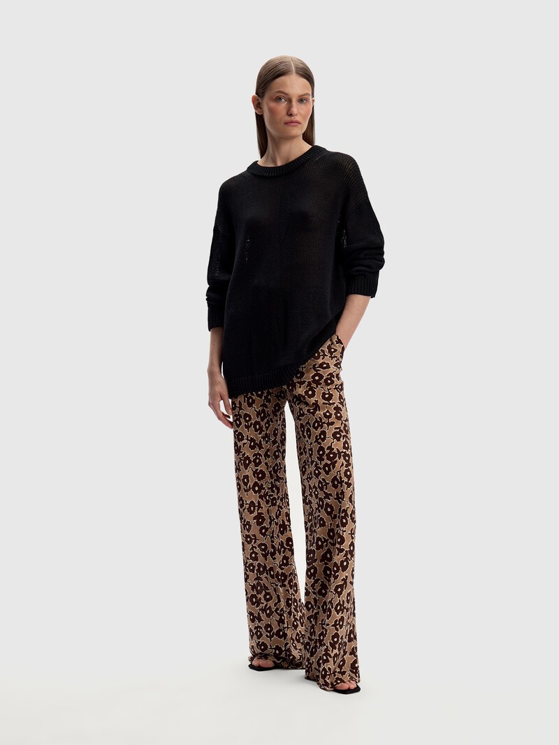 Длинные брюки из шелкового шифона — деликатного, легкого, с винтажным рисунком в стиле 60-х. Мы сделали их нарочито длинными, чтобы ткань ниспадала и струилась в движении. Идеально садятся по фигуре и подойдут к любимой обуви на каблуке. Застегиваются на молнию и перламутровую пуговицу. Деликатный материал требует бережного обращения. Аксессуары могут оставить затяжки или повредить нить. 100% Mulberry шелк — самый ценный вид шелковых волокон. Такой шелк сияет и переливается при любом освещении, а его нити тоньше, легче и прочнее аналогов.