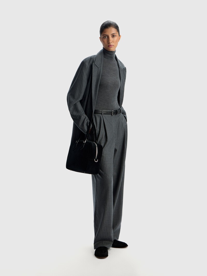 Прямые аккуратные брюки из легкой шерсти в полоску — чуть укороченные, со складками и узким поясом, который сзади мы сделали эластичным. Пластичная, ровная, чуть ворсистая ткань с твиловым переплетением произведена на фабрике в Турции. Застегиваются на молнию и крючок. Сочетайте с жакетом из нашей коллекции. Сделано в России.