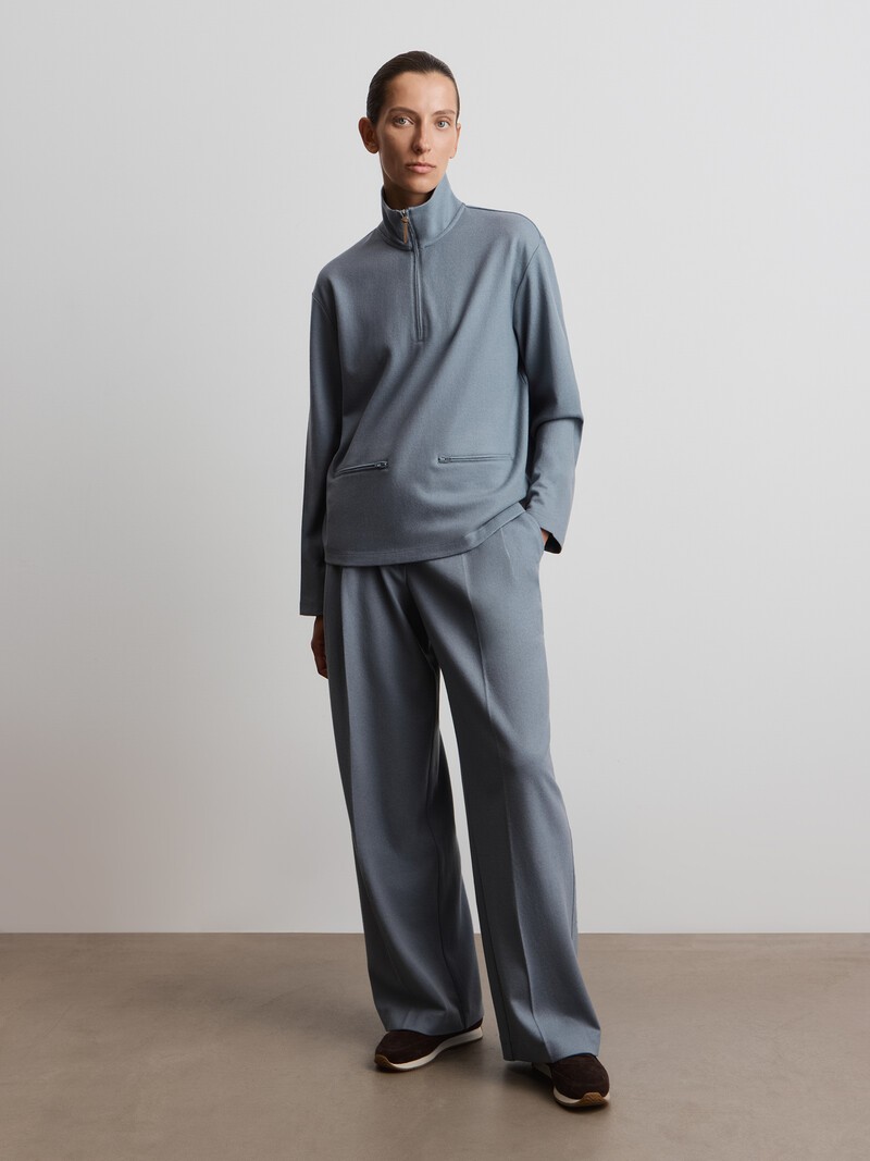 Широкие теплые брюки с заутюженными стрелками и гульфиком на молнии, как в текстильных моделях. Выполнены из мягкой и плотной шерсти от нашего китайского поставщика, слегка ворсистой с обеих сторон и приятной на ощупь. Благодаря переплетению интерлок материал хорошо держит форму и защищает изделие от деформации. Сочетайте с толстовкой из нашей коллекции.