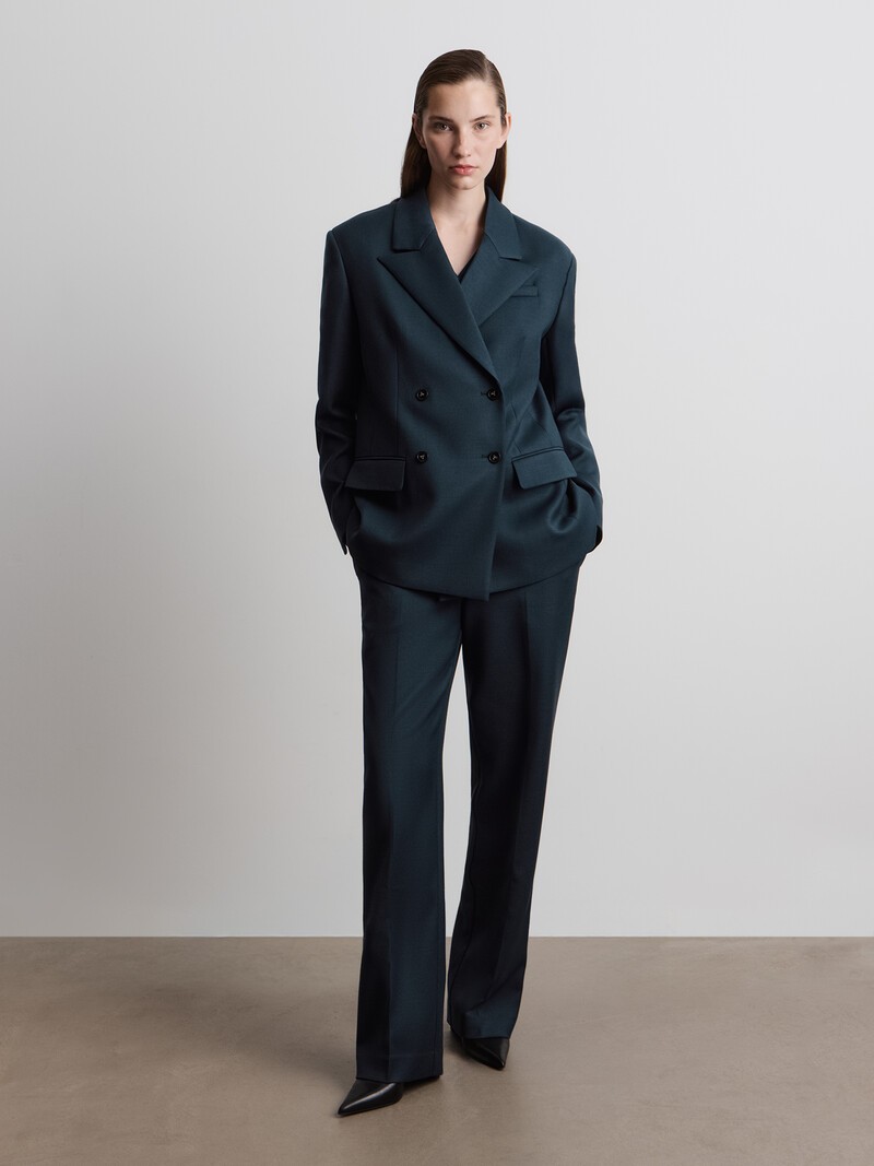 Прямые брюки чуть заниженной посадки, со стрелками и на корсажном поясе, отсылают к мужским моделям, но станут отличной основой женственных образов в праздники или будни. Выполнены из мягкой шерстяной ткани красивого глубокого оттенка с выраженным рубчиком и небольшим лоском. Застегиваются на молнию и крючок. Сочетайте с жакетом и жилетом из нашей коллекции. Сделано в Китае.