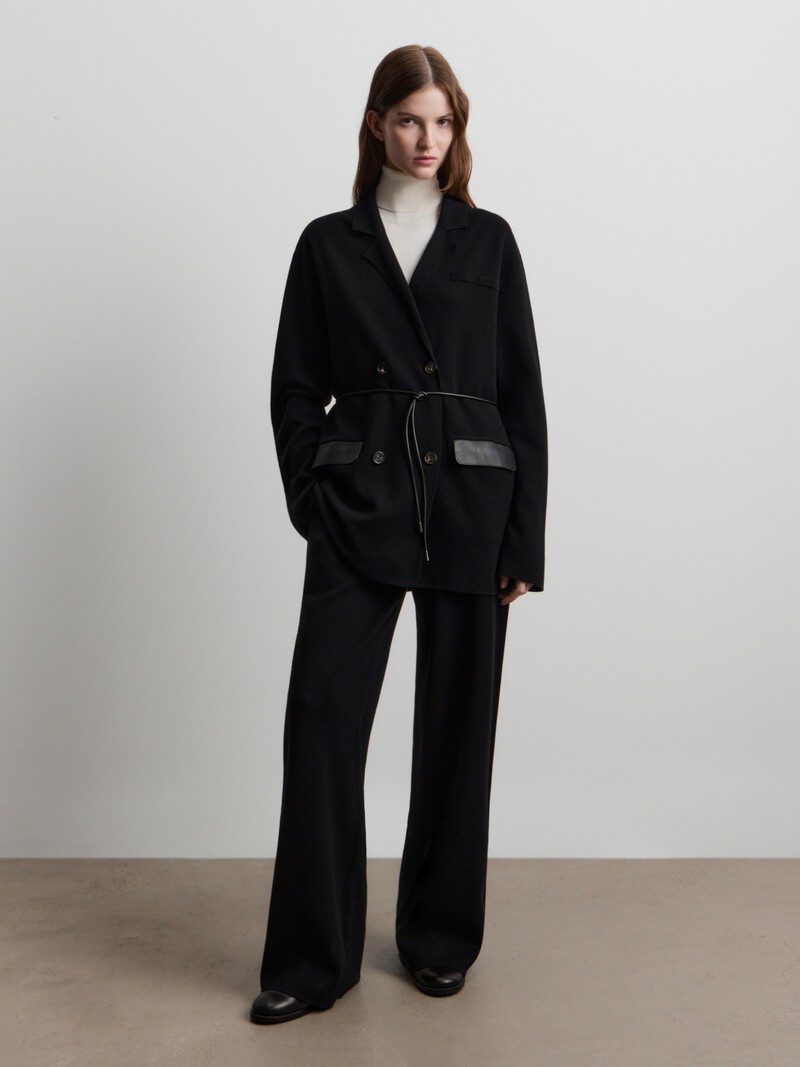 Прямые широкие брюки из плотного трикотажа — комфортные и пластичные, они легко впишутся в офисный гардероб. Связаны в одну нить из шерсти и хлопка. Такую пряжу мы часто используем в конце лета — это легкий, мягкий и приятно согревающий материал. У этого изделия низкая пиллингуемость. При правильном уходе первые пилли могут появиться на нем в среднем через 10 носок. Сделано в Китае.