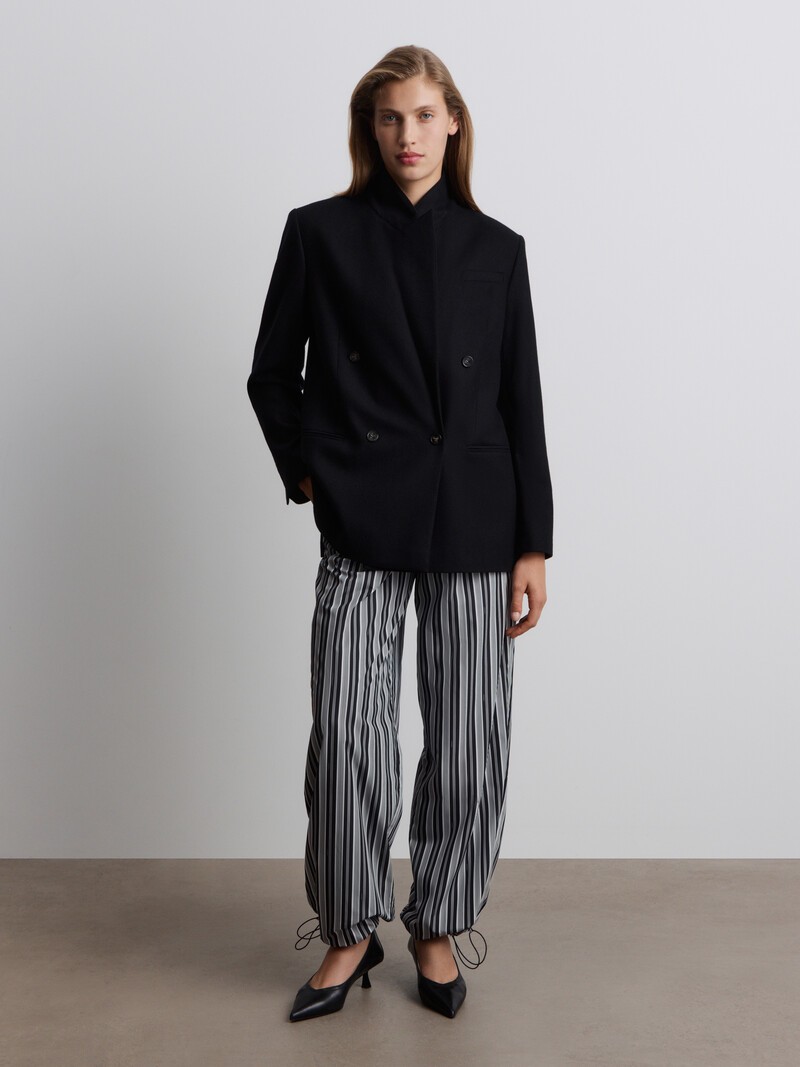 Прямые широкие брюки из тонкой и мягкой тафты, слегка шуршащей в движении. Эластичный шнурок со стоппером по нижнему краю позволяет легко менять очертания силуэта, а контрастная полоска делает образ еще более динамичным и подчеркивает мерцание ткани. Без застежки. Деликатный материал требует бережного обращения: аксессуары могут оставить затяжки или повредить нить. Сделано в Китае.