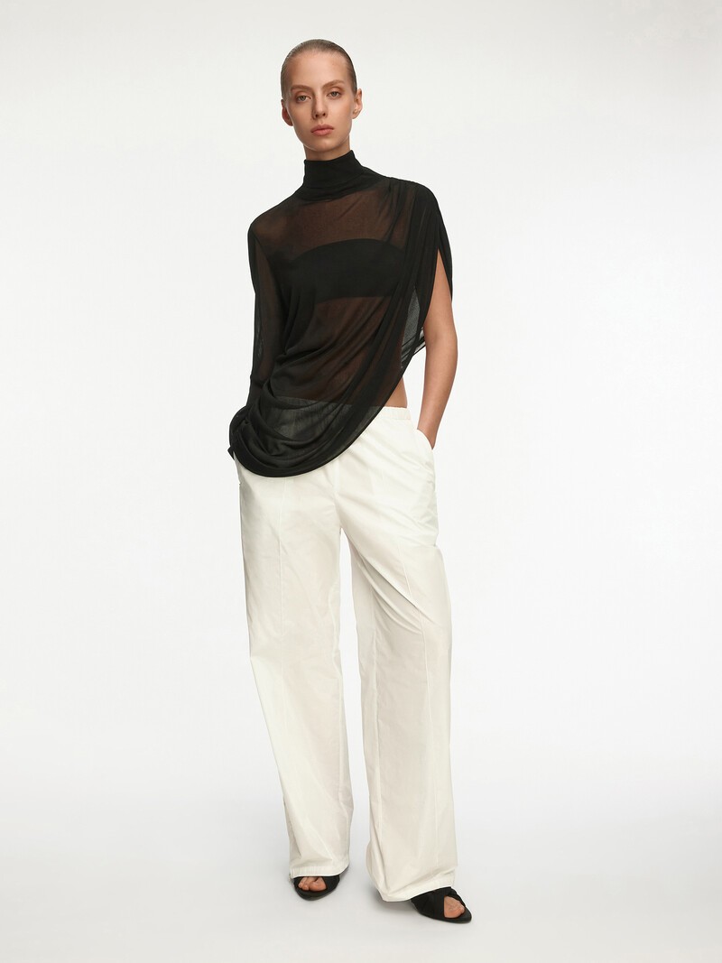 Акцентные брюки из тонкой и мягкой тафты, деликатно мерцающей в складках. Мы сделали пояс эластичным, а в карманах добавили потайные молнии, чтобы вы могли не беспокоиться об их содержимом. Благодаря универсальному молочному цвету брюки легко стилизовать для повседневных или вечерних образов. Деликатный материал требует бережного обращения: аксессуары могут оставить затяжки или повредить нить.