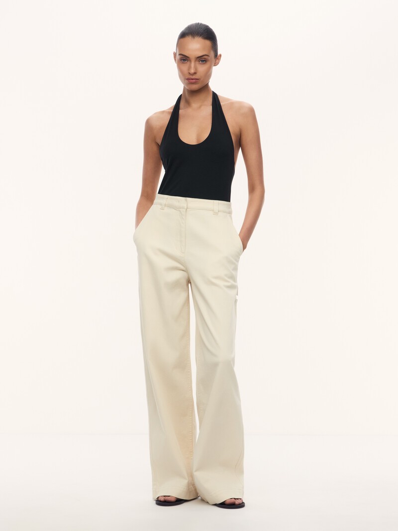 1. Плотный хлопковый твил создан в Барселоне, на фабрике, которая работает с COS, Sezane и Massimo Dutti 2. Готовые брюки выварили, как деним — это сделало ткань более мягкой и бархатистой на ощупь 3. Комфортные, как любимые джинсы: заниженная посадка и широкие от бедра брючины