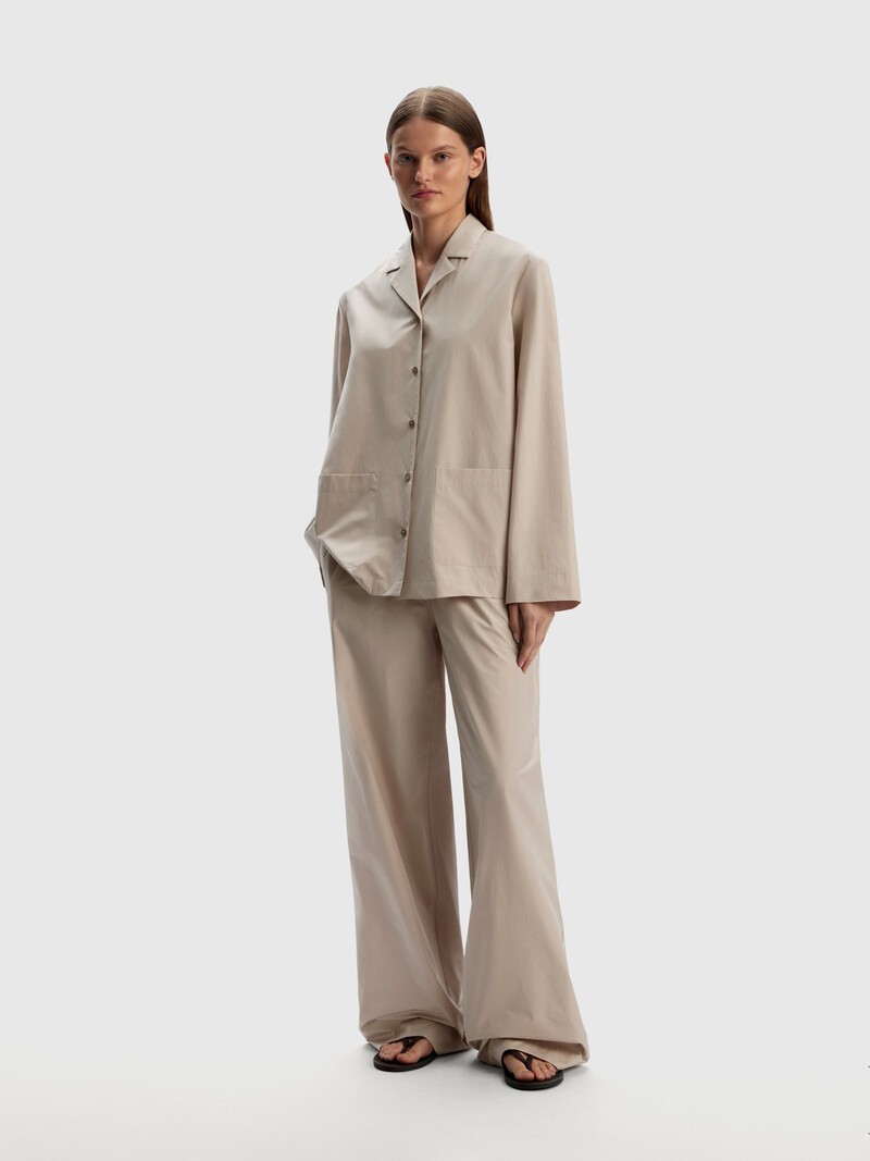 Прямые длинные брюки с эластичным поясом — для дней, когда хочется комфорта в каждом движении. Дышащий тонкий материал на основе слегка мерцает на солнце и естественно мнется, подчеркивая беспечность образа. Сделано в России.