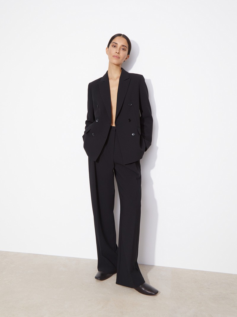 Брюки из костюмной шерсти. Высокая посадка и глубокие складки от пояса визуально вытягивают силуэт — этот эффект усиливается, если надеть брюки с обувью на каблуке. Застегиваются на молнию и крючок, есть удобные карманы по бокам и сзади. Тонкая и мягкая костюмная шерсть хорошо дышит и не перегревает кожу. Без подкладки. Сделано в России.