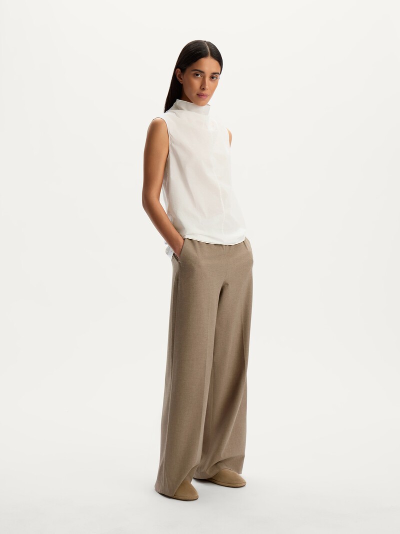 Удобные базовые брюки — прямые, со стрелками и складками. Они комфортно сидят благодаря эластичному поясу, а спокойные натуральные оттенки позволят вписать их к любой гардероб. Выполнены из гладкой матовой ткани от нашего португальского поставщика — такой материал достаточно плотный, приятный к телу и не просвечивает. Сделано в Турции.
