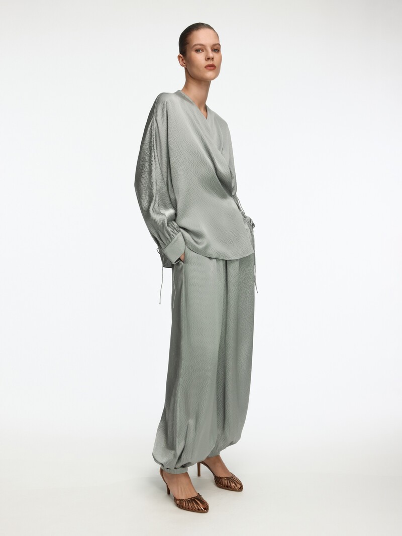 1. Шелк с жаккардовым переплетением: особая техника создает рельефный рисунок, который придает ткани плотность и эффект мерцания 2. 100% шелк Mulberry плотностью 19 momme — тонкий и прочный. Благодаря переплетению на нем не остаются разводы после машинной стирки (в щадящем режиме) 3. Не создают лишний объем: мы сделали брюки пышными, но аккуратными — без складок по бокам и с застежкой на потайную молнию в боковом шве
