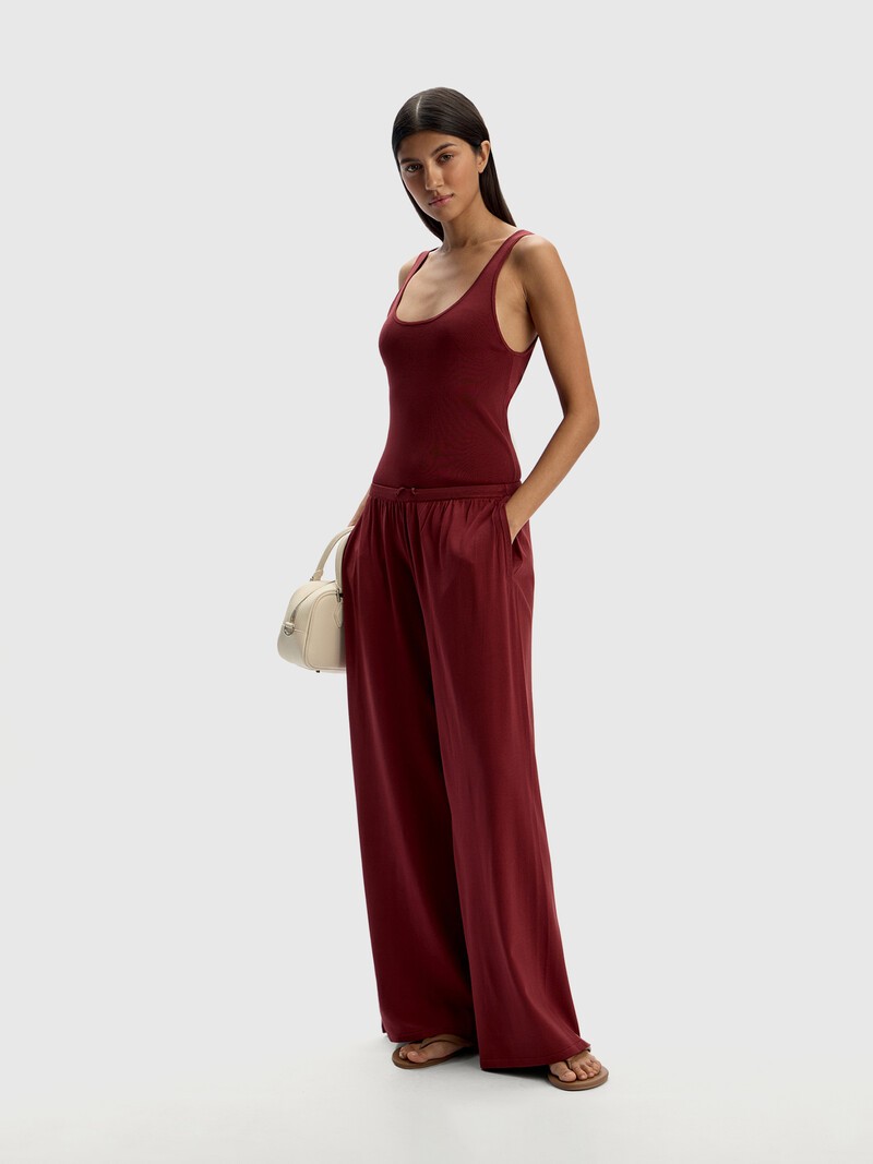 Широкие легкие брюки — для отдыха и прогулок. Слегка укороченные, чтобы вам было удобно носить их с любимыми сандалиями и кедами и двигаться так быстро, как вы захотите. Связаны из тонкой пряжи на основе вискозы, струящейся и прохладной. Сделано в Китае.