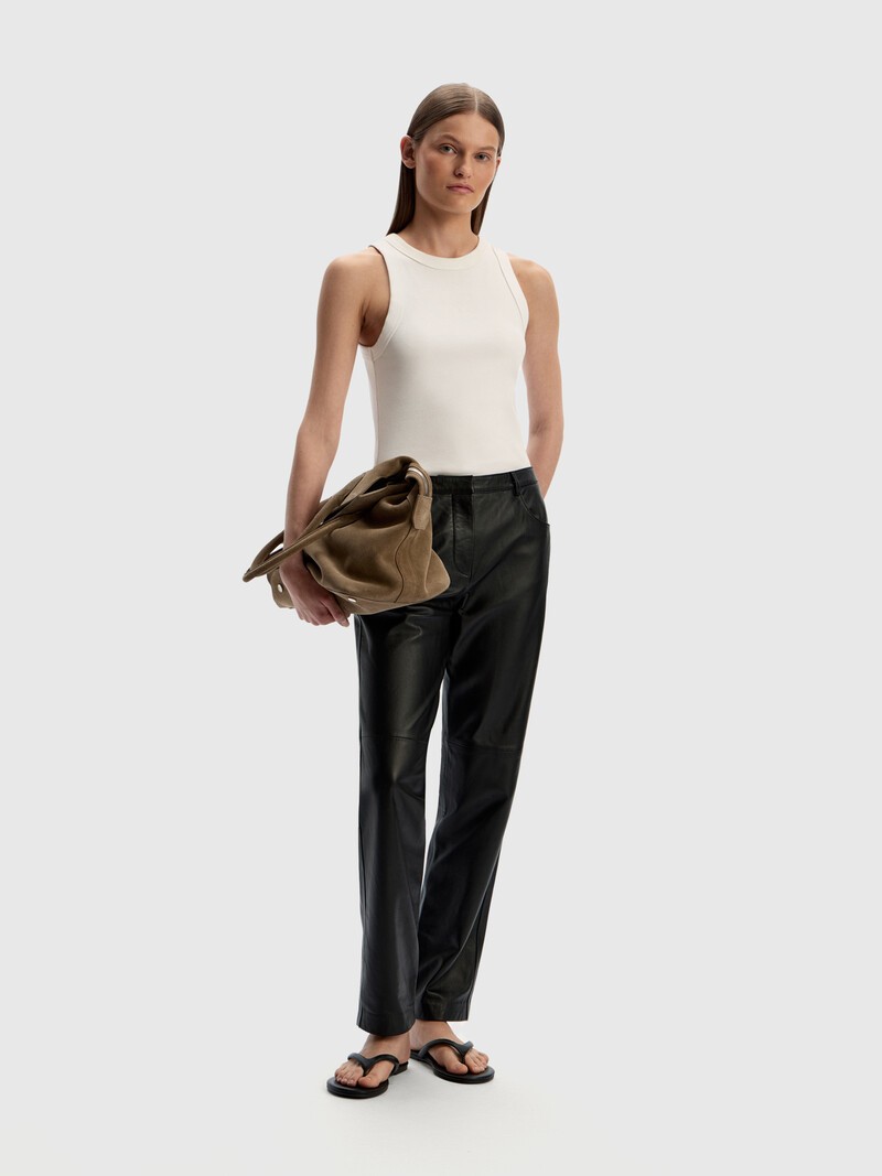 Универсальные узкие брюки из кожи: прямой силуэт, средняя посадка по талии, комфортное облегание, классический черный цвет. Выполнены из кожи ягненка, плотной, мягкой и тонкой, без дополнительных обработок. Застегиваются на молнию. На эластичной подкладке. При выборе размера убедитесь, что брюки сидят свободно — так они прослужат вам намного дольше. Серебряный статус LWG означает, что фабрика сводит к минимуму расходы электроэнергии и применение химикатов при обработке кожи, количество отходов и загрязнение сточных вод. Сделано в Турции.