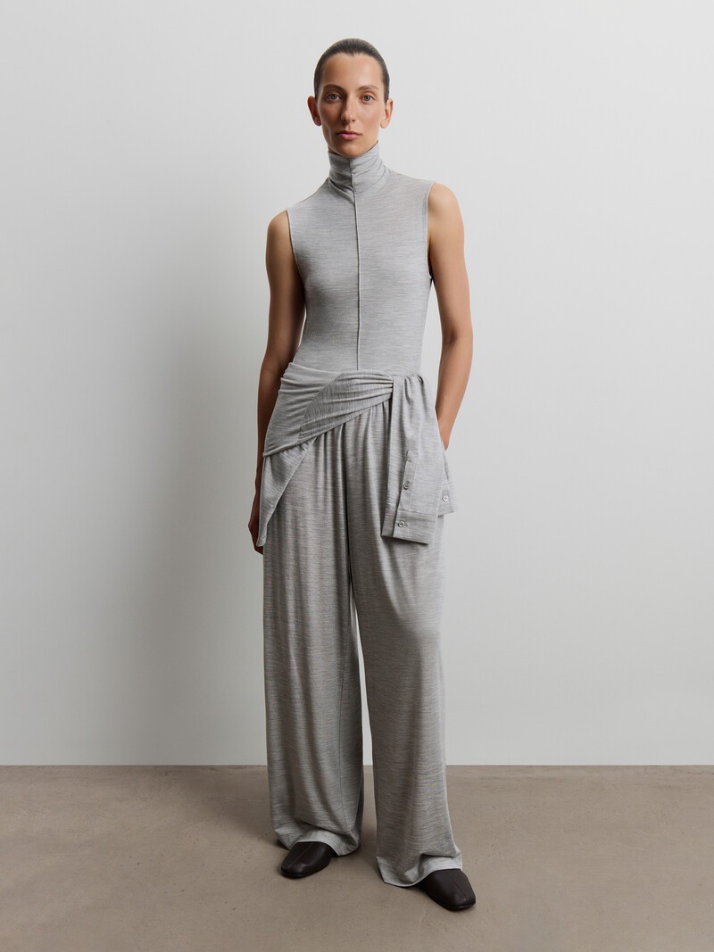 Прямые длинные брюки из тонкого трикотажа — их будет приятно носить и теплым вечером, и на исходе лета. Струящийся, гладкий и пластичный материал тактильно напоминает шелк, а добавление мягкой шерсти делает брюки еще уютнее и универсальнее. Лиоцелл — нежное на ощупь волокно из древесины эвкалипта, современная и экологичная альтернатива вискозе. Во время производства не используются токсичные вещества, поэтому вредные выбросы не загрязняют атмосферу. Сделано в Китае.