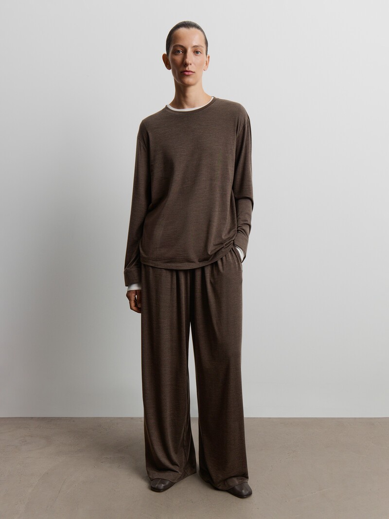 Прямые длинные брюки из тонкого трикотажа — их будет приятно носить и теплым вечером, и на исходе лета. Струящийся, гладкий и пластичный материал тактильно напоминает шелк, а добавление мягкой шерсти делает брюки еще уютнее и универсальнее. Лиоцелл — нежное на ощупь волокно из древесины эвкалипта, современная и экологичная альтернатива вискозе. Во время производства не используются токсичные вещества, поэтому вредные выбросы не загрязняют атмосферу. Сделано в Китае.
