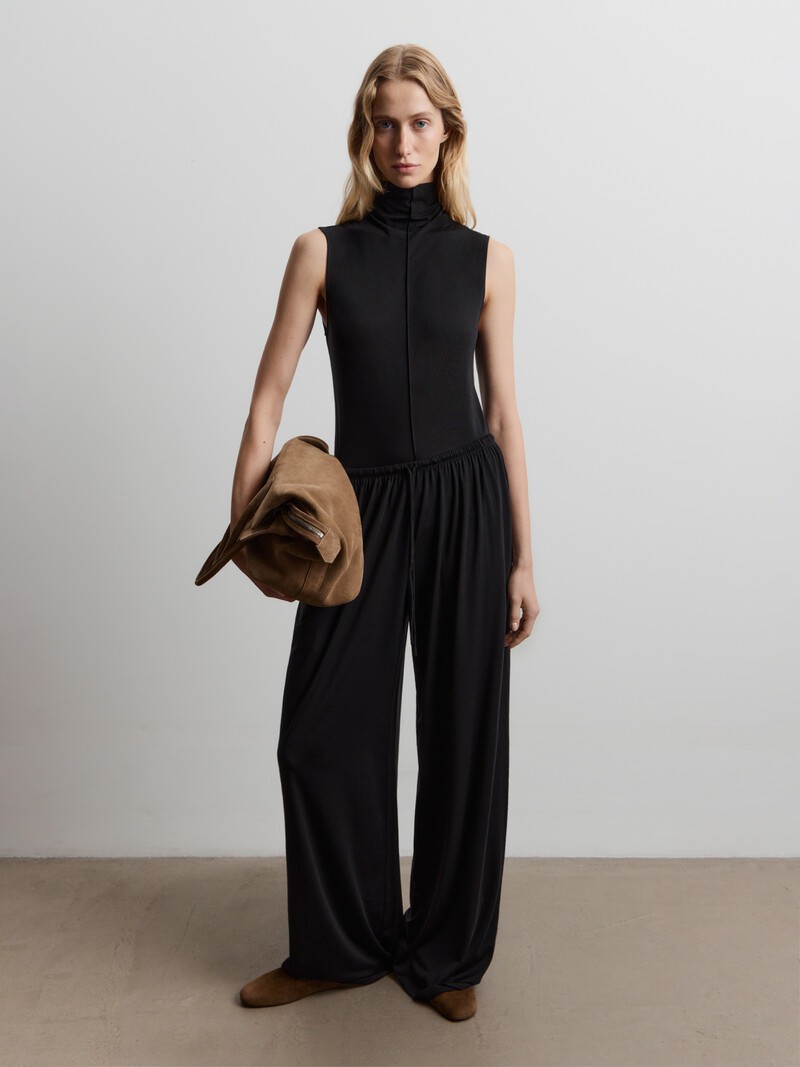 Прямые длинные брюки из тонкого трикотажа — их будет приятно носить и теплым вечером, и на исходе лета. Струящийся, гладкий и пластичный материал тактильно напоминает шелк, а добавление мягкой шерсти делает брюки еще уютнее и универсальнее. Лиоцелл — нежное на ощупь волокно из древесины эвкалипта, современная и экологичная альтернатива вискозе. Во время производства не используются токсичные вещества, поэтому вредные выбросы не загрязняют атмосферу. Сделано в Китае.