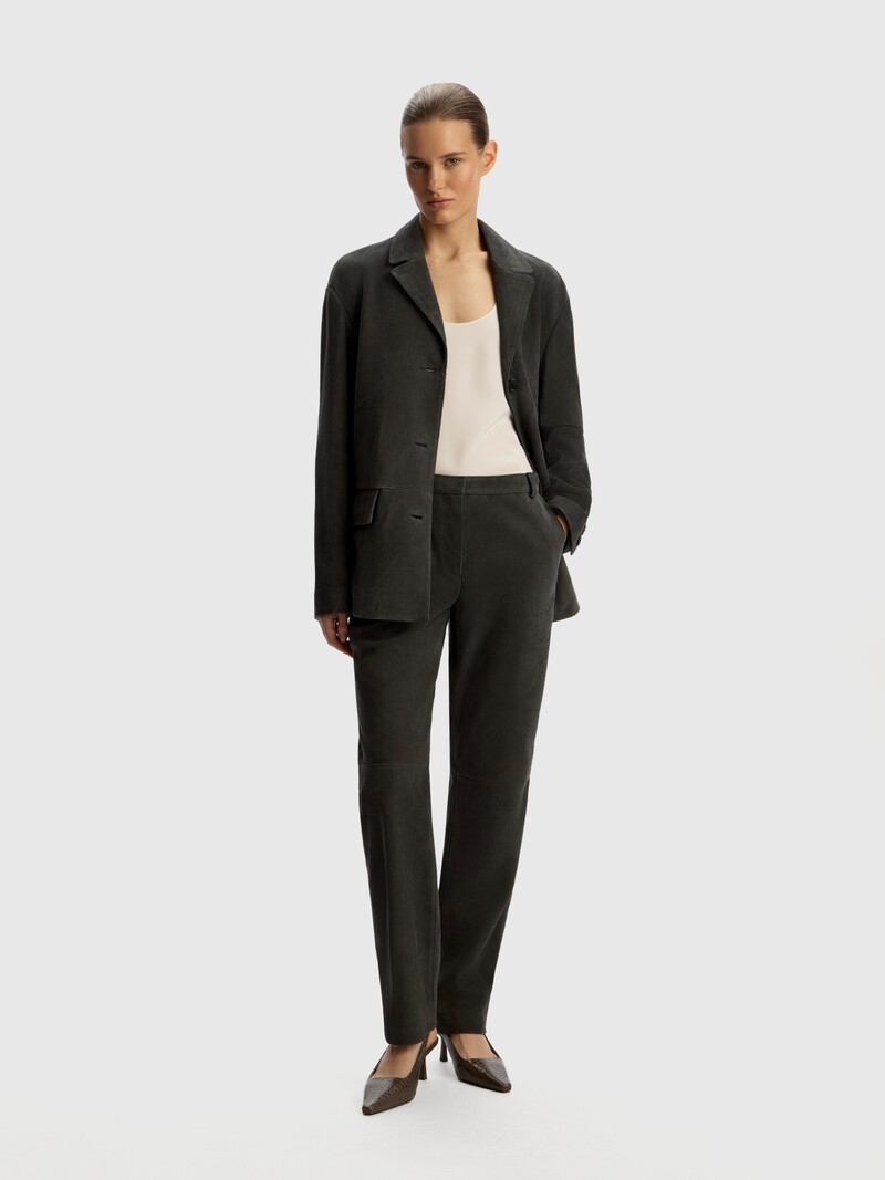 Лаконичные прямые брюки, чуть зауженные книзу — наш бестселлер. Такая модель подойдет и к смокингу, и к повседневному блейзеру. Выполнены из мягкой пластичной замши с ровным велюровым ворсом, долговечной и дышащей. На эластичной подкладке. Застегиваются на молнию и крючок. При выборе размера убедитесь, что брюки сидят свободно — так они прослужат вам намного дольше. Серебряный статус LWG означает, что фабрика руководствуется принципами экологической безопасности используемых красителей, имеет необходимые очистные сооружения и заботится о здоровье сотрудников.