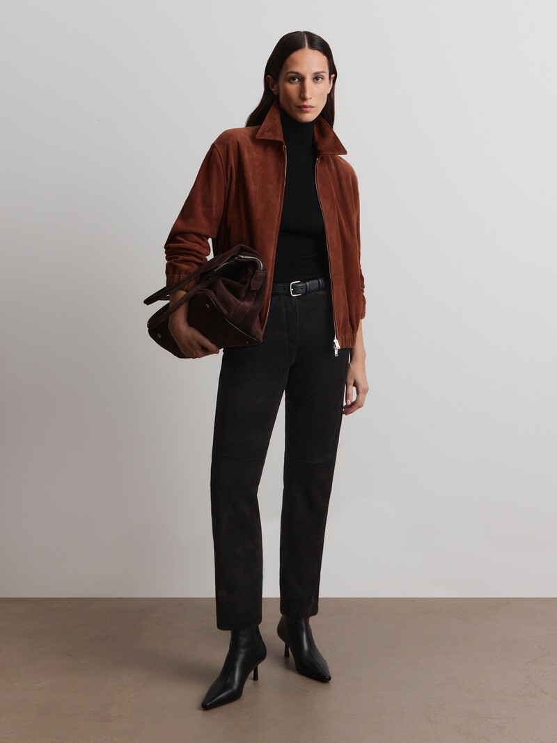Лаконичные прямые брюки, чуть зауженные книзу — наш бестселлер. Такая модель подойдет и к смокингу, и к повседневному блейзеру. Выполнены из мягкой пластичной замши с ровным велюровым ворсом, долговечной и дышащей. На эластичной подкладке. Застегиваются на молнию и крючок. При выборе размера убедитесь, что брюки сидят свободно — так они прослужат вам намного дольше. Серебряный статус LWG означает, что фабрика руководствуется принципами экологической безопасности используемых красителей, имеет необходимые очистные сооружения и заботится о здоровье сотрудников. Сделано в Турции.
