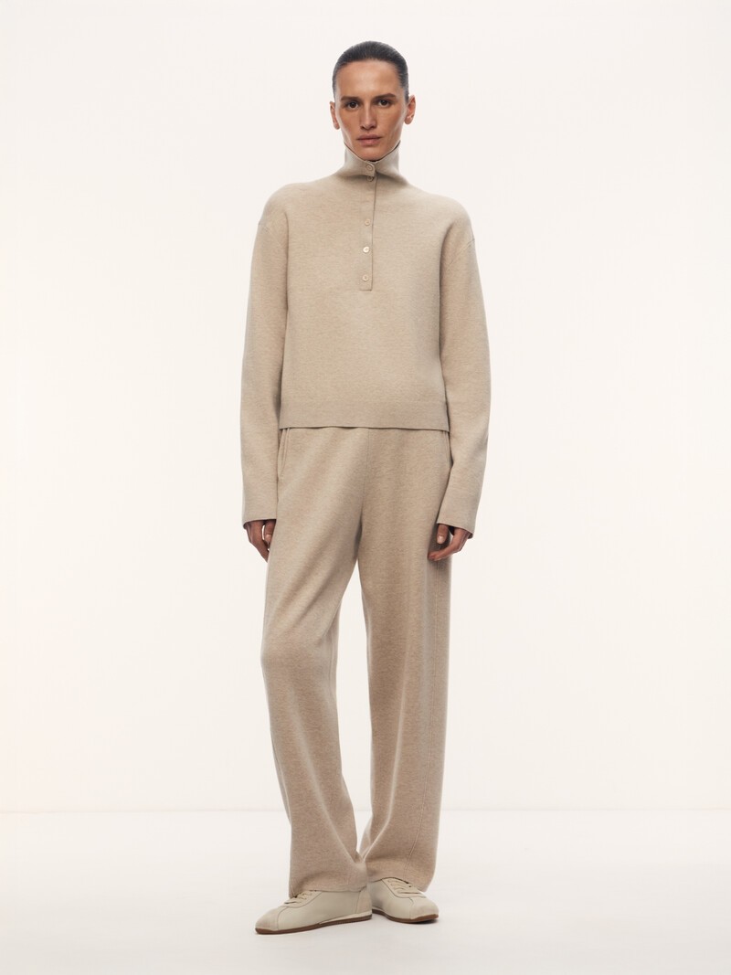 1. Связаны из тонкой и легкой нити: шерсть мериноса согревает, а хлопок придает воздушность 2. Редко пиллингуются и сохраняют форму благодаря двойному переплетению Milano stitch — такой трикотаж ровный и плотный, как ткань 3. Слегка укорочены — удобно носить в сезон слякоти и снегопадов 4. Эластичный пояс дополнили вязаным шнурком, чтобы вам легко было посадить брюки по фигуре