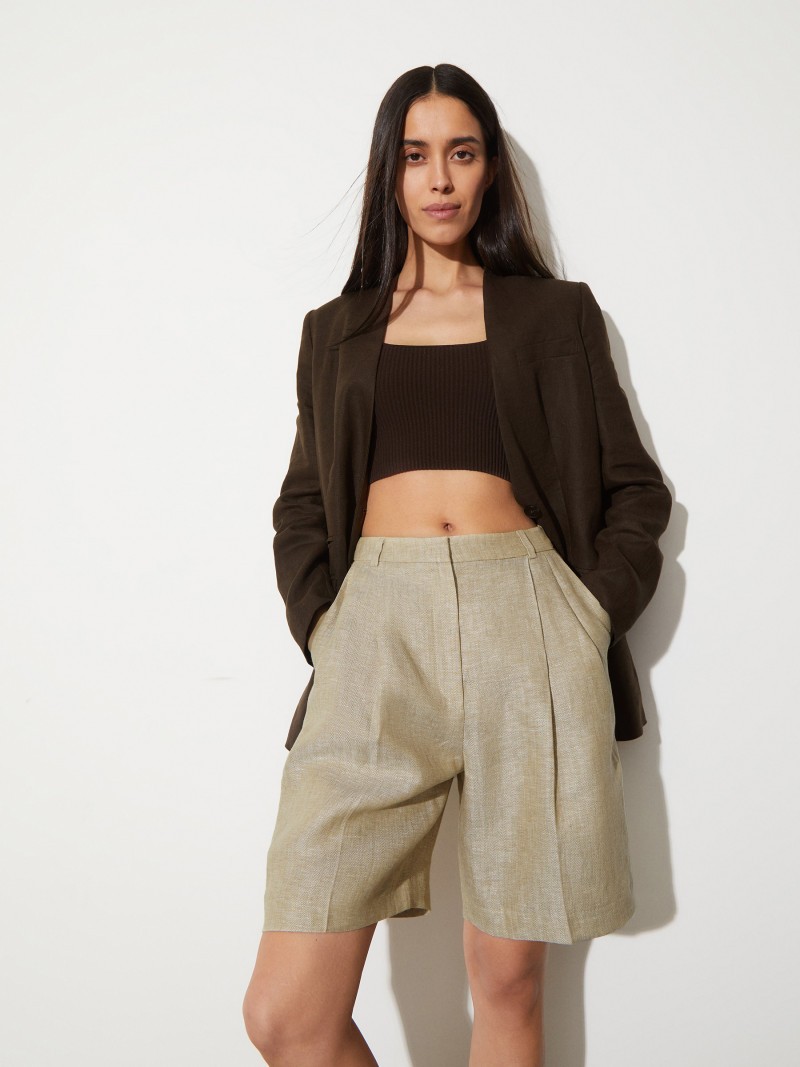 Костюмные шорты со стрелками и застежкой на молнию и крючок отлично впишутся в образ со свободным жакетом или белой футболкой. Для модели выбрали особенную ткань: плотный дышащий лен с переплетением «в елочку», где бежевую нить оттеняет молочная. Без подкладки. European Flax — сертифицированный европейский лен высшего качества: помогает сократить глобальный углеродный след, безопасен для человека и становится лучше с каждой стиркой Сделано в России.