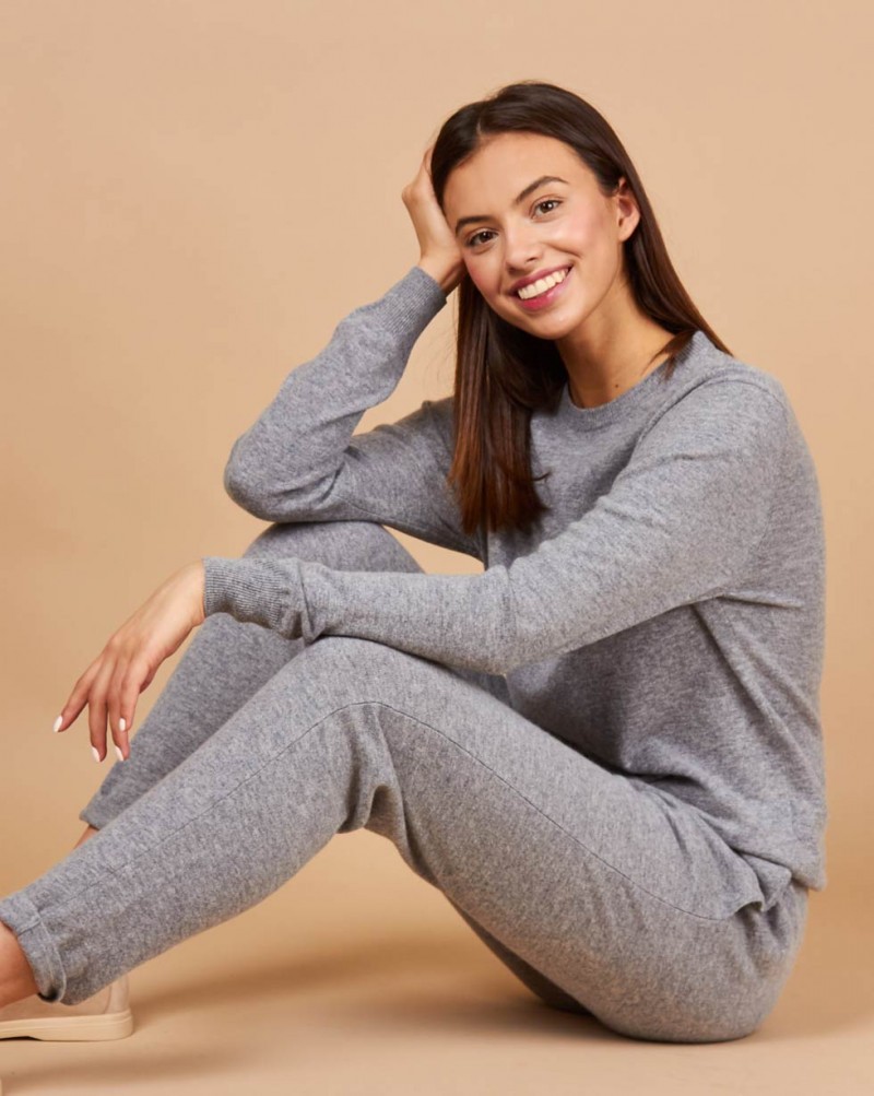 Костюм из кашемира и шерсти: свитер с круглым вырезом и брюки на завязках серого оттенка. Костюм отлично сочетается с кедами или ботинками. Сделано в Китае