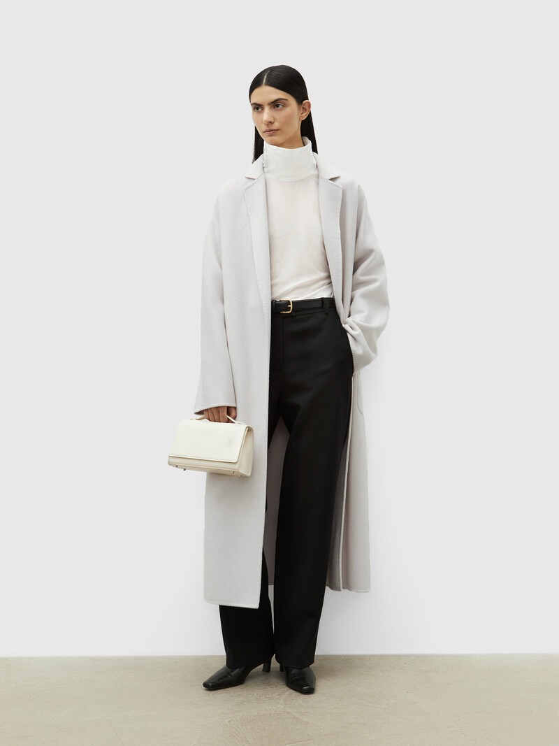 Лимитированный выпуск нашего бестселлера — классическое пальто на запáх с широкими полами и длинным поясом. Материал этого пальто соткан из собранного и очищенного вручную пуха горных коз, а уложенный волнами ворс подчеркивает природный блеск и пластичность кашемира. Технология double face делает пальто теплее даже без подкладки: изделие сшивается из двухслойной ткани, а все швы с изнаночной стороны выглядят так же, как с лицевой.
