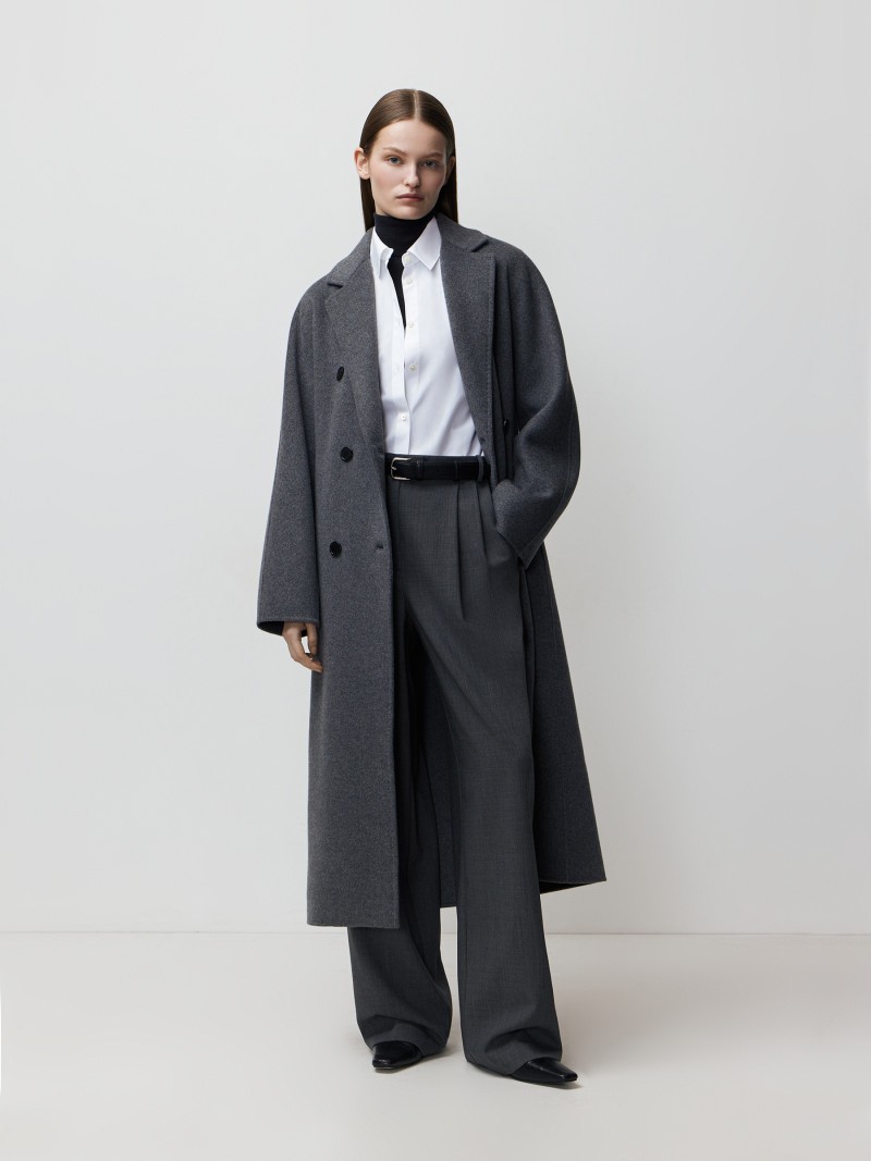 Лаконичное двубортное пальто: свободный силуэт, объемные плечи, застежка на контрастные пуговицы. Благодаря мягким линиям и удачной длине его легко вписать в любой гардероб. Выполнено из легкой шерсти австралийского мериноса с добавлением нежных кашемировых волокон. Подкладки нет, но два слоя ткани, соединенные незаметными швами по технологии double face, позволяют носить пальто даже зимой. Сделано в Китае.