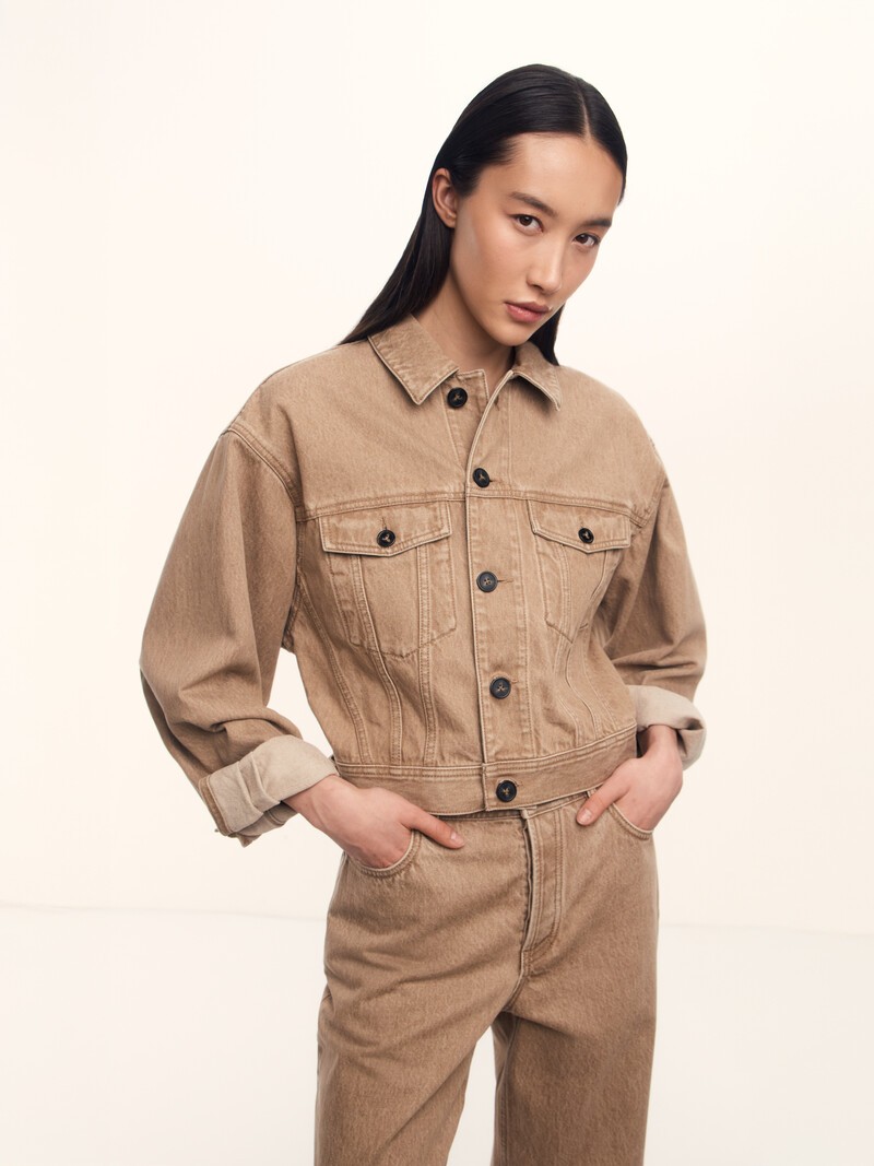 1. Новинка в нашей коллекции — слегка укороченная и компактная куртка, которая подчеркивает фигуру 2. Плотный и тактильно приятный деним 13 Oz, который выварили до песочного — на швах заметны деликатные эффекты Stone Wash 3. Застегивается на болты