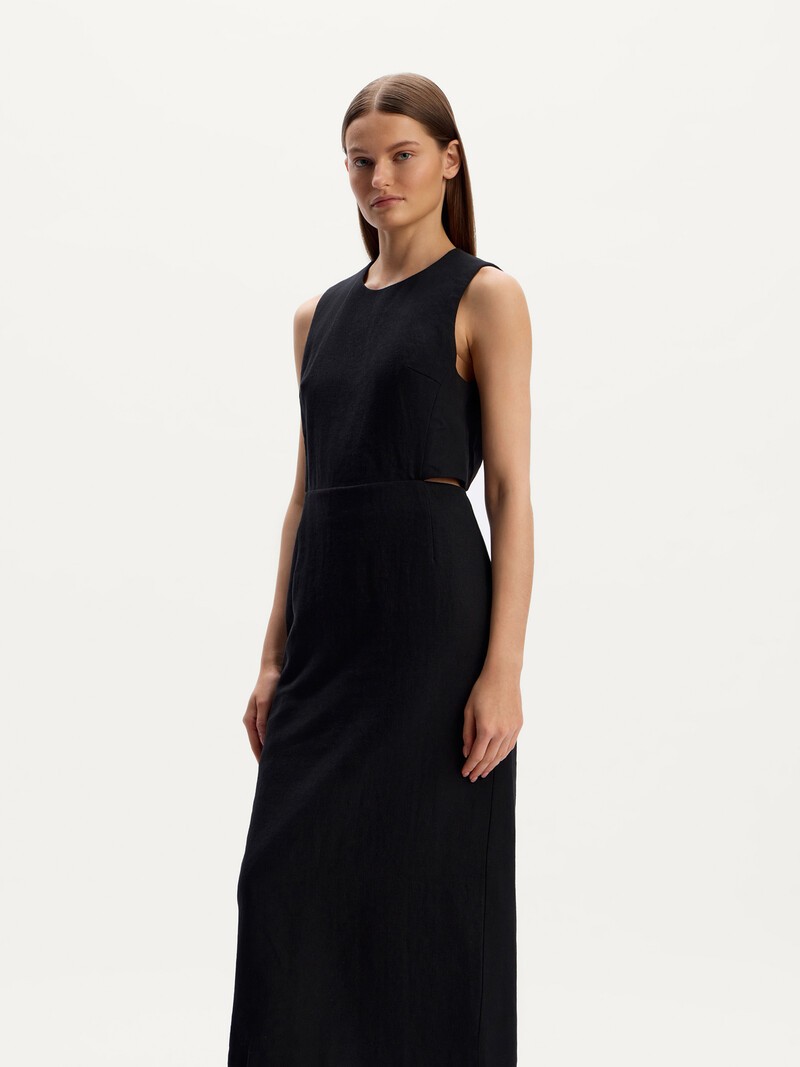 Элегантное и комфортное платье для летних дней. У этой модели необычный крой: спереди платье напоминает футляр, а со спины выглядит как комбинация свободного топа и юбки. Выполнено из португальской ткани на основе льна с добавлением волокон вискозы и полиэстера. Она отличается неоднородной фактурой, присущей натуральным материалам, но более мягкая и меньше мнется. На подкладке из тонкого хлопка. Сделано в России.