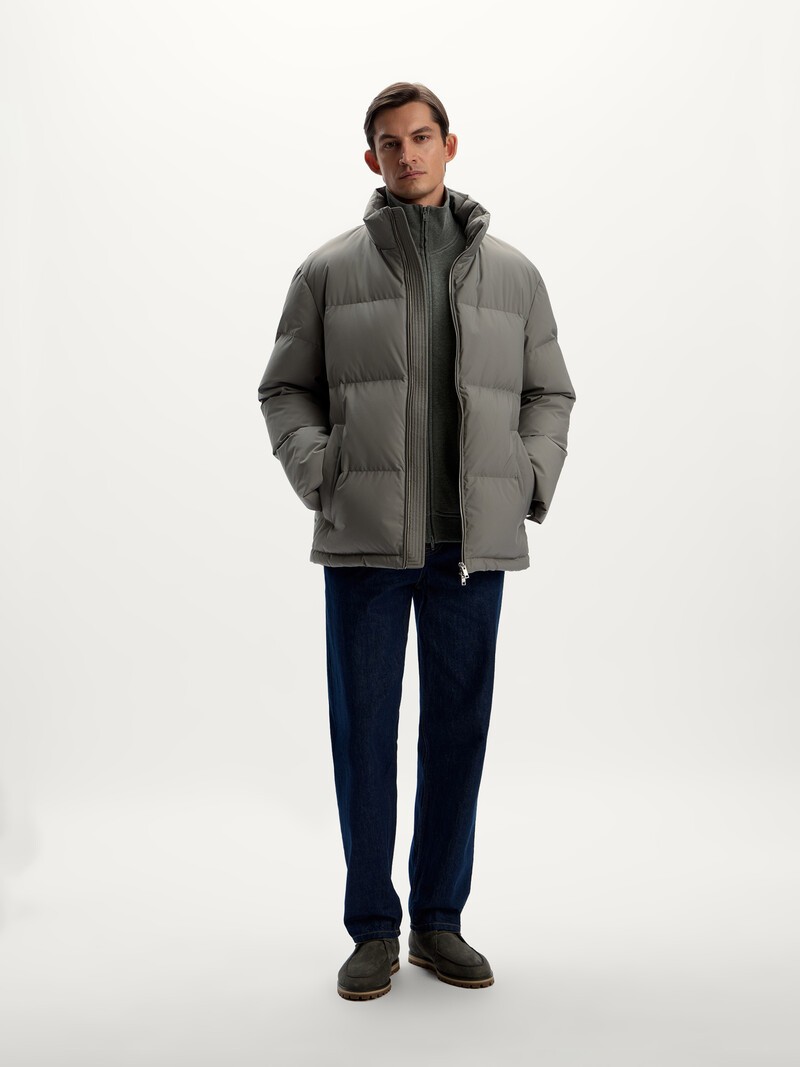 Свободный пуховик без капюшона, с контрастной ярко-синей подкладкой — универсальная модель на каждый день. Внутренние вязаные манжеты из шерсти, ветрощащитная планка и кулиска со стоперами по нижнему краю помогут надолго сохранить тепло. Ткань матовая, плотная, дополненная слоем флиса, который защищает от ветра, и заводским WR. Внутри — натуральный утиный пух. Застегивается на металлическую молнию. Индекс Fill Power — 750, максимально высокий для натурального утиного пуха. Сделано в Китае.