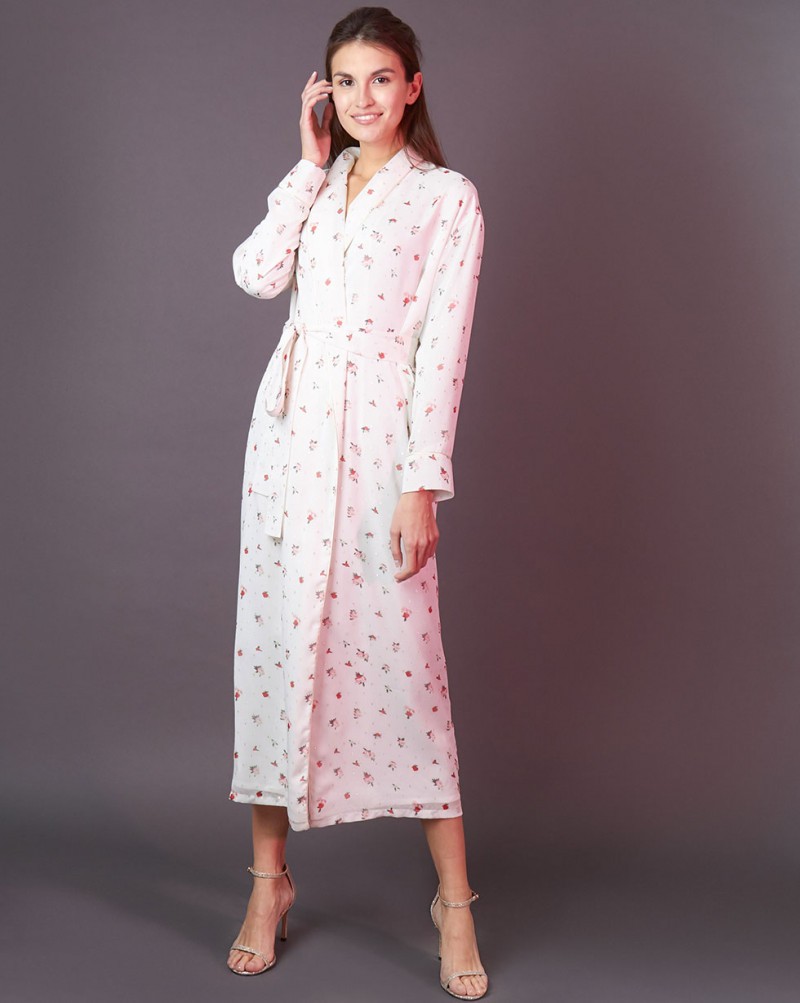 Платье-халат свободного силуэта с запахом, на подкладке. Съёмный пояс, отделка кантом. Необычный контраст цветов красного цвета на светлом фоне. Дополните образ обувью на каблуке и маленькой сумочкой. Платье выполнено из деликатной ткани. Не рекомендуется сильно растягивать ткань или туго завязывать пояс. Сделано в России