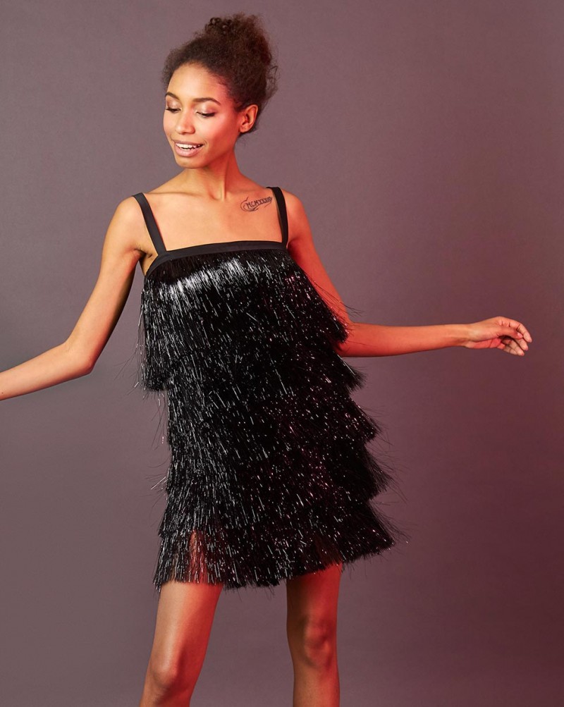 Вечернее платье на бретелях в ретро стиле. Бахрома на платье выполнена из тесьмы с блестящим эффектом, что создает праздничное настроение. Дополните образ изящными украшениями и обувью на каблуке. Требует бережного обращения - при растягивании ткани бахрома может частично осыпаться. Вытянувшиеся концы подравниваются ножницами. Сделано в России