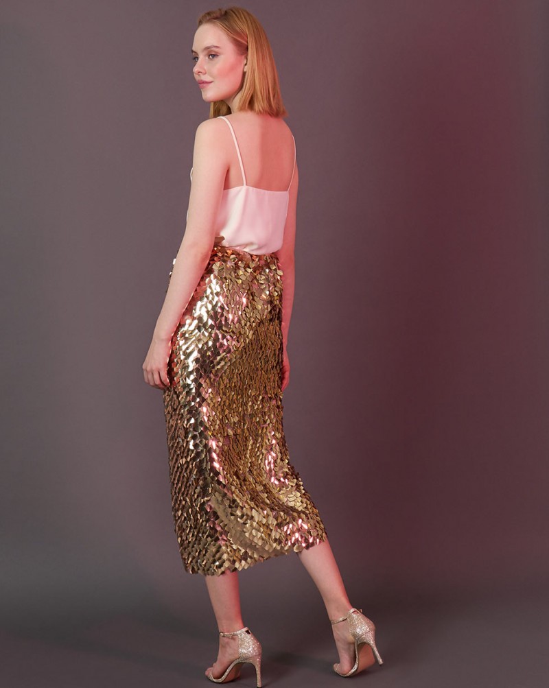 Юбка миди прямого кроя на подкладке. Необычный материал, полностью расшитый крупными пайетками, делает юбку классического силуэта прекрасным вариантом для вечернего образа. Блуза или топ из шелка дополнит и уравновесит образ. Декоративная ткань требует бережного отношения, так как все пайетки пришиваются единой нитью. Сделано в России