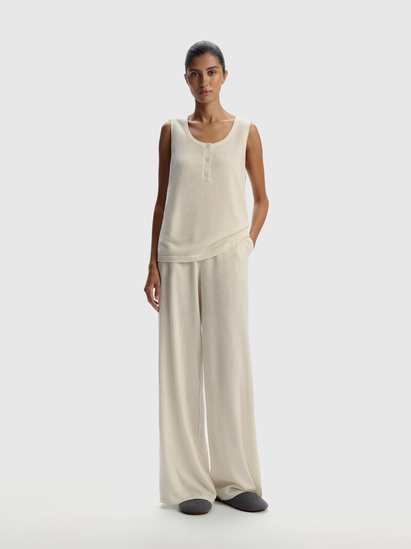 Широкие брюки с карманами, на эластичном поясе со шнурком — для отдыха и комфортных расслабленных образов. Связаны в одну нить мелкими петлями из тонкой мериносовой пряжи и кашемира, поэтому ощущаются на теле очень легкими и уютными. Сочетайте с топом и кардиганом из нашей коллекции. Сделано в Китае.