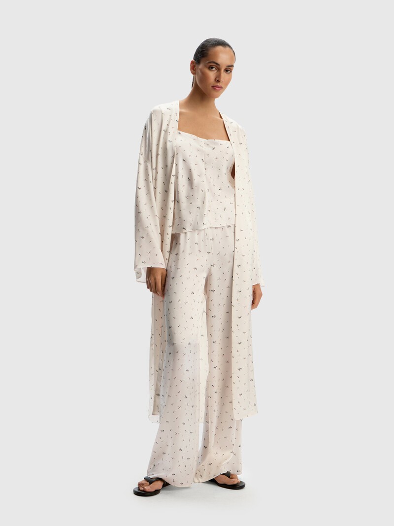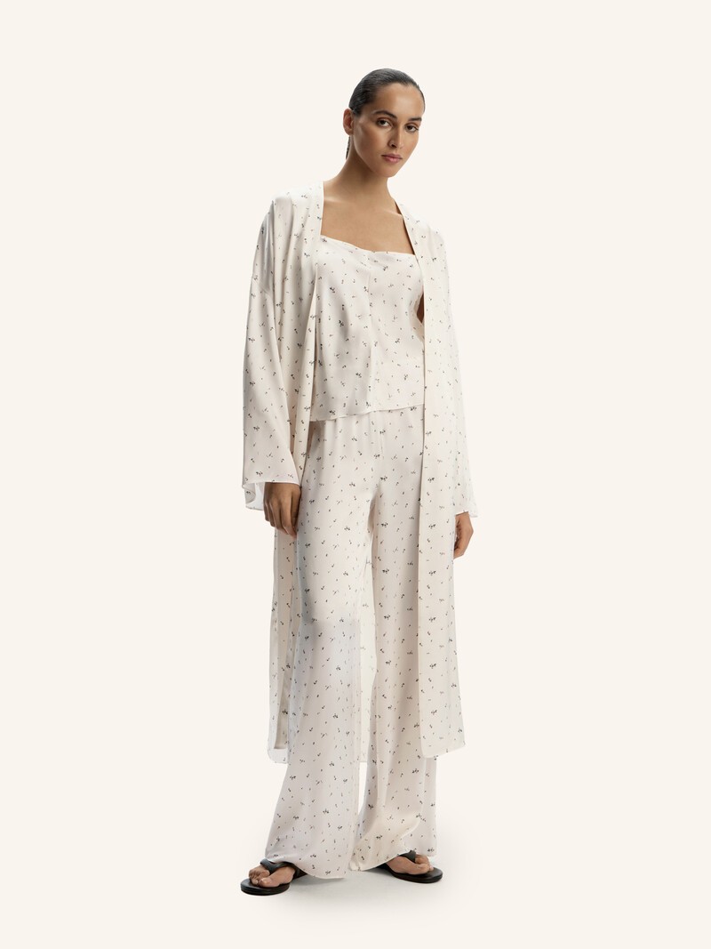 Свободный и лаконичный халат длины макси — широкий, с внутренними завязками и поясом на нитевидных шлевках. Выполнен из тонкого шелка с сатиновым переплетением, которое придает материалу выраженный блеск, и немного винтажным принтом. 100% Mulberry шелк — самый ценный вид шелковых волокон. Такой шелк сияет и переливается при любом освещении, а его нити тоньше, легче и прочнее аналогов.