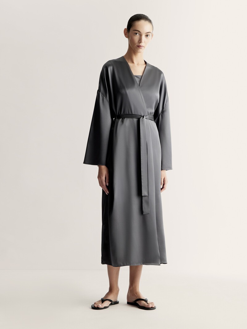 Роскошный халат макси из натурального тутового шелка — широкий, достаточно свободный, с внутренними завязками и поясом на нитевидных шлевках. Мы сделали его простым и лаконичным, чтобы создать акцент на материале — прохладном, пластичном струящемся, эффектно поблескивающием в складках. 100% Mulberry шелк — самый ценный вид шелковых волокон. Такой шелк сияет и переливается при любом освещении, а его нити тоньше, легче и прочнее аналогов.