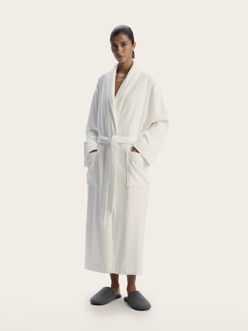 Уютный и лаконичный халат для дома — прямой силуэт, длина чуть ниже колена, накладные карманы и пояс на шлевках. Отделан тонким кантом в тон ткани, что добавляет ему изящества. Материал — 100% махровый хлопок от нашего турецкого поставщика из региона Памуккале, где исторически производится лучший домашний текстиль.