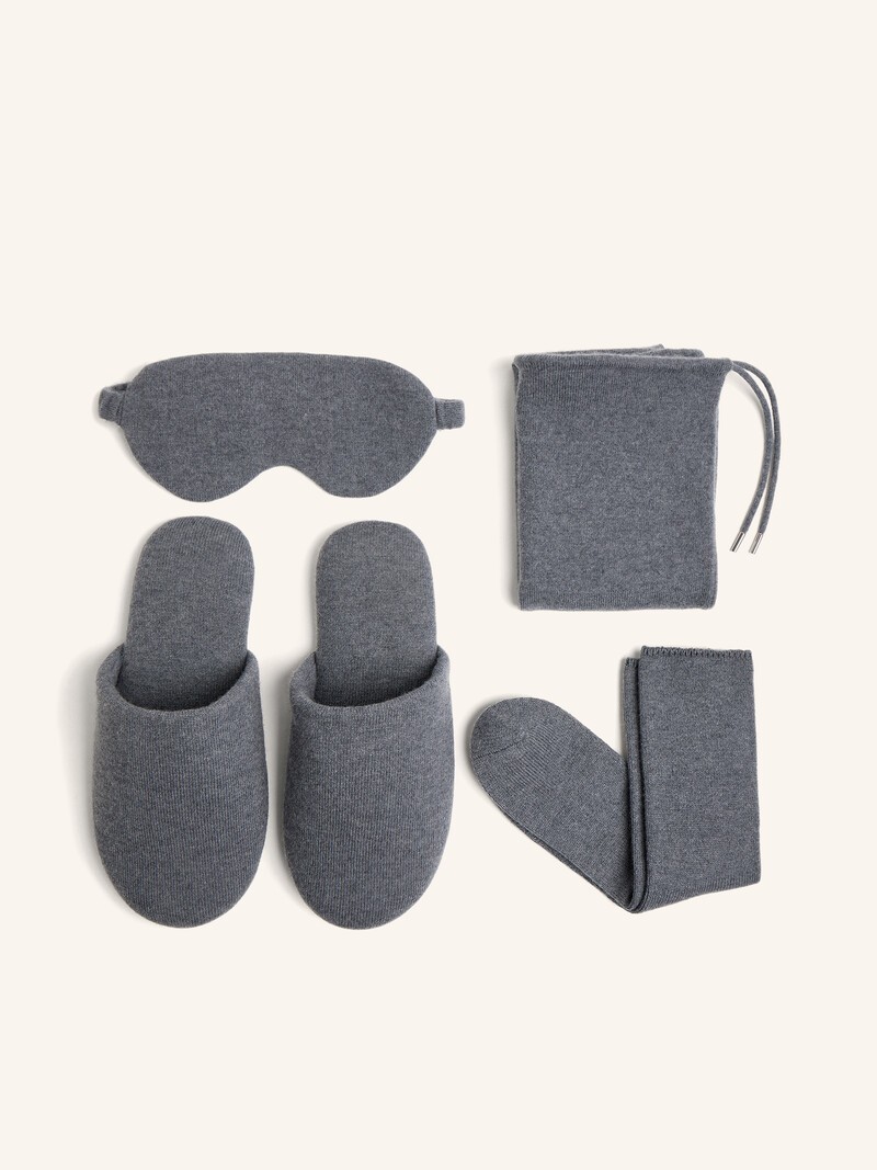 Набор для путешествий — маска для сна, тапочки и носки — позволит везде чувствовать себя как дома. Все изделия выполнены из мериносовой шерсти и нежного кашемира. Сторону маски, которая соприкасается с лицом, мы сделали из прохладного шелка. Подошва у тапочек — долговечный плотный текстиль, напоминающий замшу. Набор продается в удобном мешочке с кулиской и может стать отличным подарком.