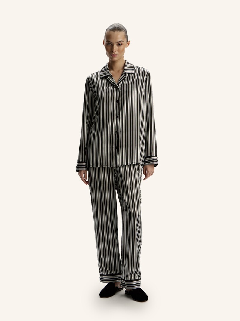 Пижама из шелкового сатина в полоску — для спокойного отдыха и вечеринок в гостиной. Свободная рубашка с перламутровыми пуговицами и брюки на эластичном поясе отделаны по краям тонким контрастным кантом. При производстве тутового шелка плотностью 25 момми не используются химические составы, благодаря чему материал получается не только красивым, но и долговечным. Продается в фирменной коробке. 100% Mulberry шелк — самый ценный вид шелковых волокон. Сотканный из тончайших прочных нитей, этот материал сияет и переливается при любом освещении.