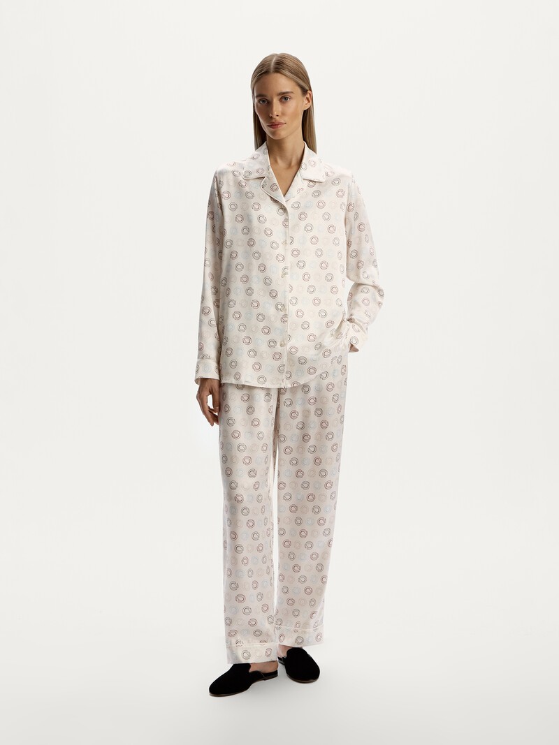 Пижама из шелкового сатина с лаконичным принтом — для спокойного отдыха и вечеринок в гостиной. Свободная рубашка с перламутровыми пуговицами и брюки на эластичном поясе отделаны по краям тонким контрастным кантом. При производстве тутового шелка плотностью 25 момми не используются химические составы, благодаря чему материал получается не только красивым, но и долговечным. Продается в фирменной коробке. 100% Mulberry шелк — самый ценный вид шелковых волокон. Сотканный из тончайших прочных нитей, этот материал сияет и переливается при любом освещении. Сделано в Китае.