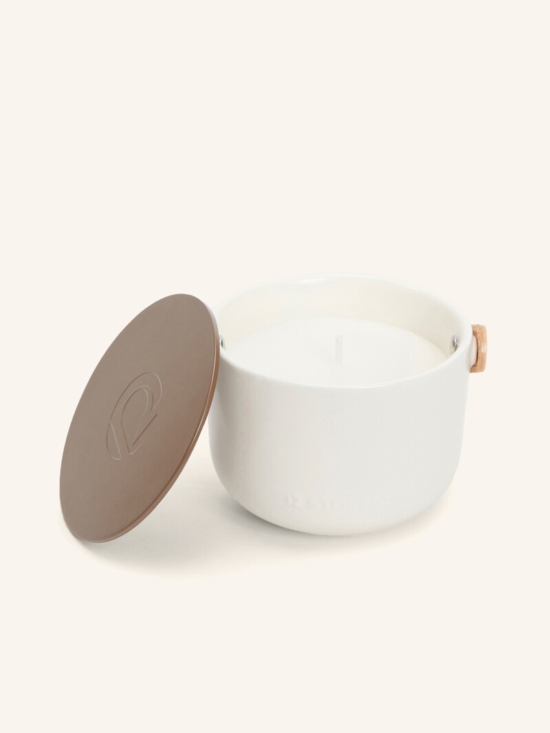 Большая восковая свеча с деликатным ароматом, в котором сочетаются ноты ириса, мускуса и горечавки. Широкая керамическая пиала молочного оттенка дополнена ручкой из толстой кожи. Подставкой может служить металлическая крышка с логотипом 12 STOREEZ. Продается в подарочной упаковке.