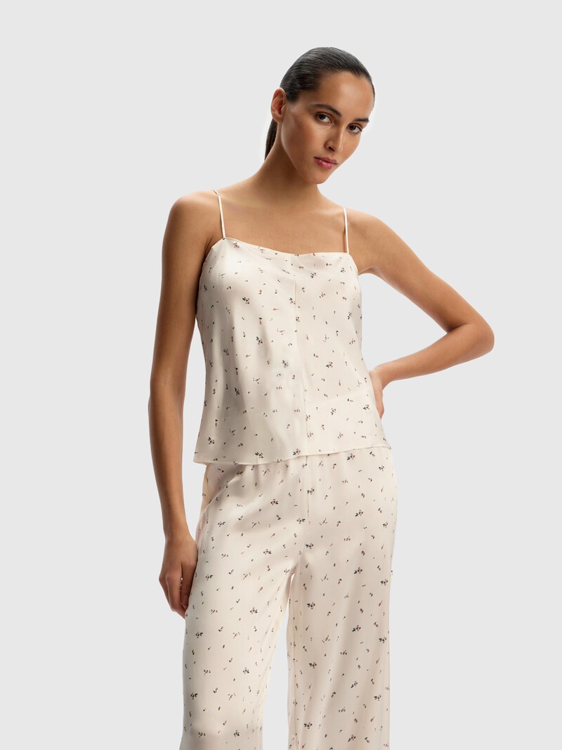 Прямой аккуратный топ на изящных бретелях с регуляторами — для отдыха или сна. Принт с чуть винтажным характером — ягодки и листики нарисованы от руки. Сатиновое переплетение придает тонкому шелку выраженный блеск, а значит, топ сделает наряднее любой образ, даже домашний. 100% Mulberry шелк — самый ценный вид шелковых волокон. Такой шелк сияет и переливается при любом освещении, а его нити тоньше, легче и прочнее аналогов.