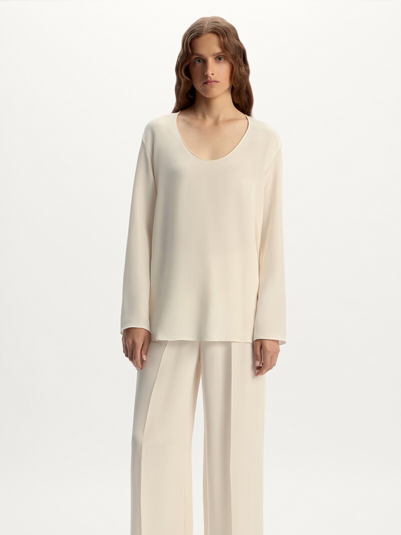Модель Imperfect — экспериментальный образец или изделие с незаметными на первый взгляд нюансами вроде неровного шва. Такие модели не проходят требования к качеству 12 STOREEZ, но мы ценим вложенные в них труд и ресурсы: каждая может прослужить вам много лет и стать любимой. Прямая минималистичная блузка с глубоким овальным вырезом и еле заметными обработками швов напоминает лонгслив: комфортная и аккуратная, она создает расслабленный женственный образ. Благодаря универсальному оттенку и классической длине модель дополнит вечерний или повседневный костюм. Выполнена из плотного тутового шелка, приятно холодящего кожу. 100% Mulberry шелк — самый ценный вид шелковых волокон. Сотканный из тончайших нитей, этот матовый материал отличается особой прочностью. Сделано в России.