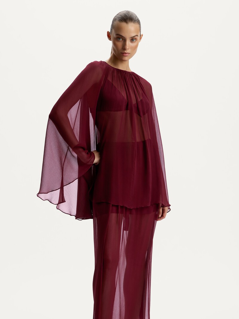 Модель Imperfect — экспериментальный образец или изделие с незаметными на первый взгляд нюансами вроде неровного шва. Такие модели не проходят требования к качеству 12 STOREEZ, но мы ценим вложенные в них труд и ресурсы: каждая может прослужить вам много лет и стать любимой. Вечерний комплект глубокого винного цвета для вечеринок или пляжных фотосессий. Его можно дополнить юбкой из нашей коллекции или стилизовать для многослойных образов с джинсами или легкими брюками. Лиф с эластичной тесьмой под грудью выполнен из плотного шелка Mulberry, а свободная блузка-накидка с застежкой на пуговку — из прозрачного и летящего шелкового шифона. Бретели лифа регулируются. Деликатный материал требует бережного обращения: аксессуары могут оставить затяжки или повредить нить. Сделано в России.