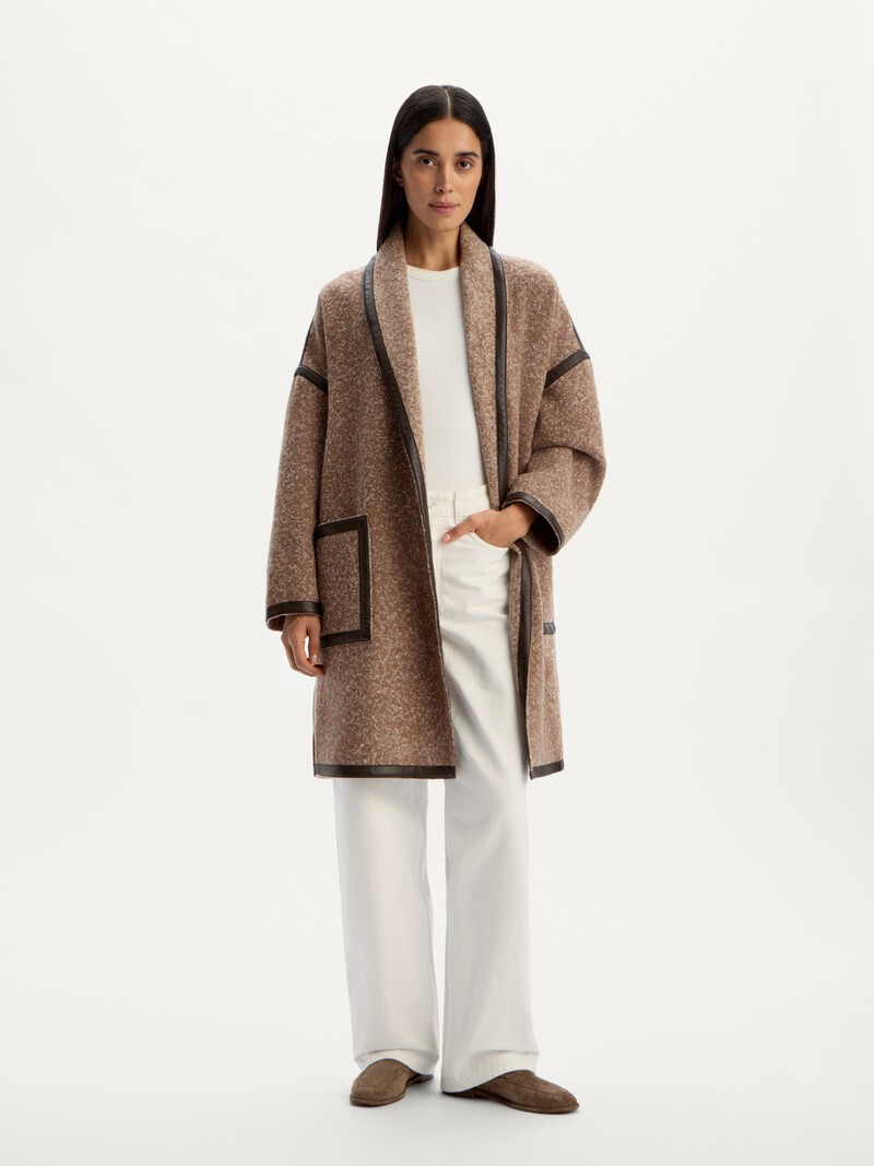 Модель Imperfect — экспериментальный образец или изделие с незаметными на первый взгляд нюансами вроде неровного шва. Такие модели не проходят требования к качеству 12 STOREEZ, но мы ценим вложенные в них труд и ресурсы: каждая может прослужить вам много лет и стать любимой. Пальто-халат с кожаным поясом. Широкие рукава с низкой проймой, плавный шалевый воротник, акцентные накладные карманы — все вместе создает расслабленный и одновременно яркий образ. Выполнено из шерсти молодой альпаки сури — мягкого, легкого сырья без остевого волоса. Наш поставщик прядет нить высочайшего качества и сочетает ее с другими волокнами для создания необычной меланжевой фактуры и большей долговечности. Все швы и края аккуратно закрыты контрастным кожаным кантом. Без подкладки. Сделано в Китае.