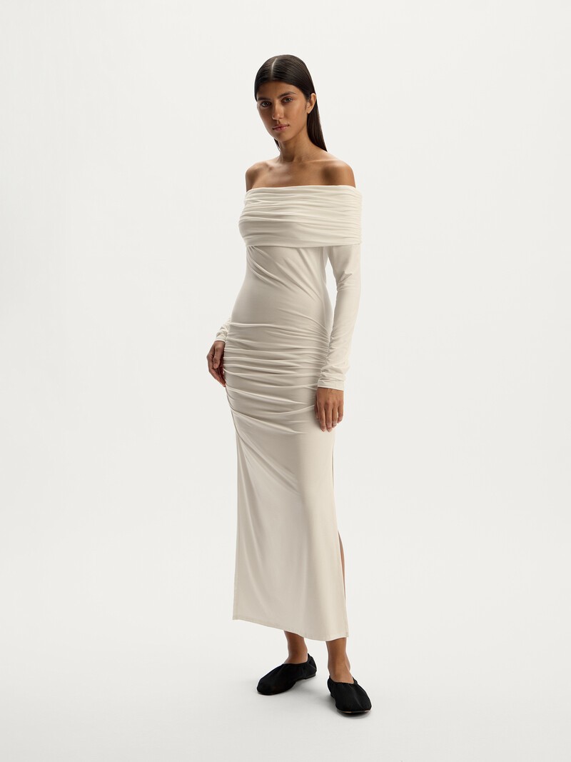 Модель Imperfect — экспериментальный образец или изделие с незаметными на первый взгляд нюансами вроде неровного шва. Такие модели не проходят требования к качеству 12 STOREEZ, но мы ценим вложенные в них труд и ресурсы: каждая может прослужить вам много лет и стать любимой. Платье длины макси для комфортных женственных образов — узкая юбка с высоким разрезом, открытые плечи, драпированный отворот, акцентный удлиненный рукав. Такое можно носить с сандалиями или вьетнамками: мы сделали швы эластичными, а значит, модель не стесняет движений. Выполнено из легкой струящейся ткани из смеси модала и шелка. Рекомендуем выбирать бесшовное белье. Сделано в Китае.