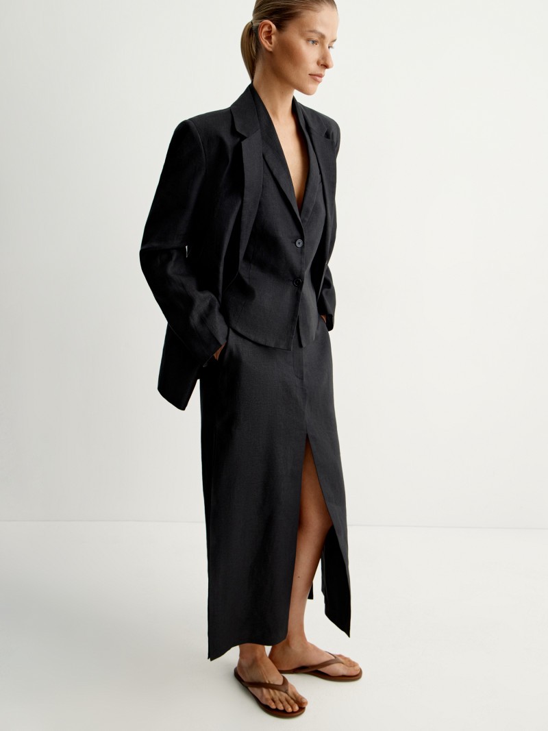 Модель Imperfect — экспериментальный образец или изделие с незаметными на первый взгляд нюансами вроде неровного шва. Такие модели не проходят требования к качеству 12 STOREEZ, но мы ценим вложенные в них труд и ресурсы: каждая может прослужить вам много лет и стать любимой. Длинная юбка с чуть спущенной линией талии и четырьмя высокими разрезами эффектно распахивается в движении. Выполнена из гладкого, плотного матового льна саржевого переплетения, который хорошо держит форму. Сочетайте с жилетом и жакетом из нашей коллекции. European Flax — сертифицированный европейский лен высшего качества: помогает сократить глобальный углеродный след, безопасен для человека и становится лучше с каждой стиркой Сделано в Китае.