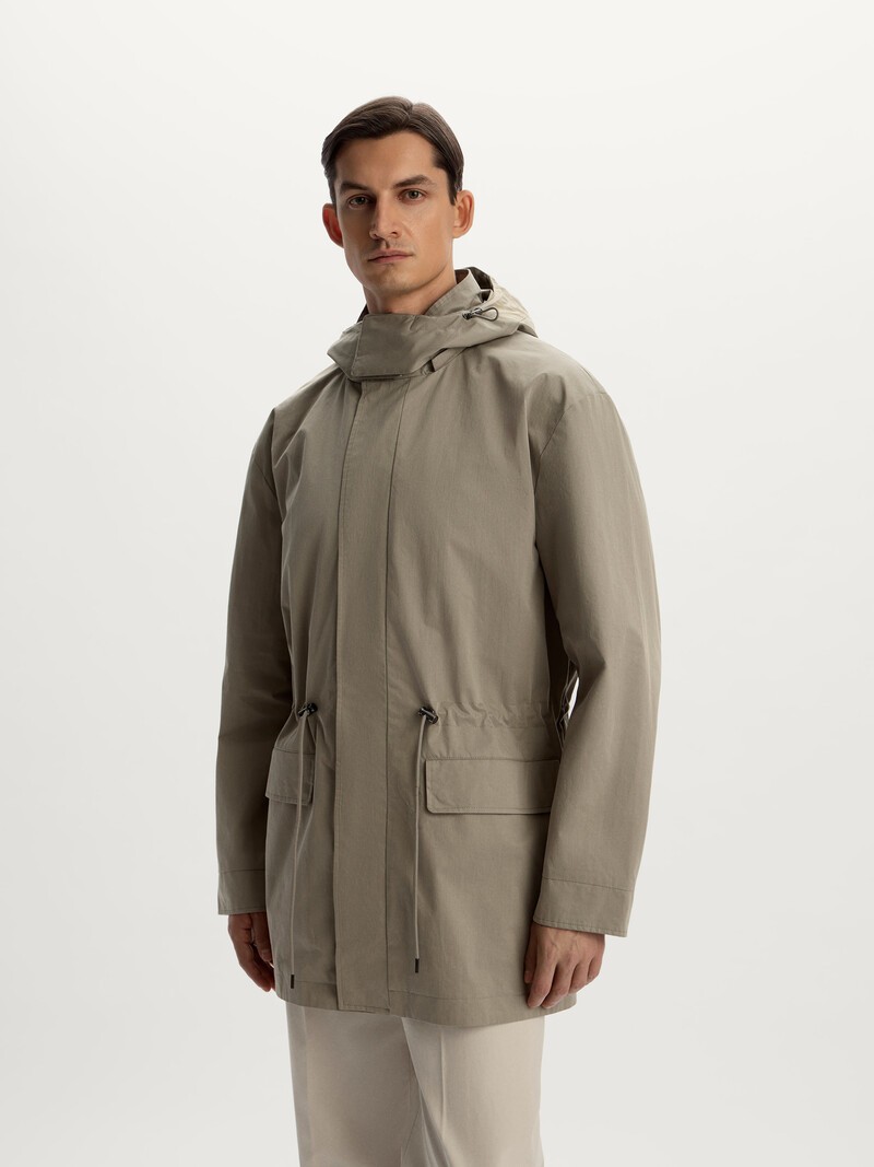Объемная парка длиной до середины бедра. Спущенное плечо, съемный капюшон, кулиска на уровне пояса — такая модель заменит классический тренч или легкую куртку в осенние дни. Ткань верха — плотный хлопковый твил с WR для защиты от легких осадков, приятный на ощупь и хорошо сохраняющий форму. На комбинированной подкладке с двумя карманами. Без утеплителя. Застегивается на молнию и планку на кнопках. Сделано в Беларуси.