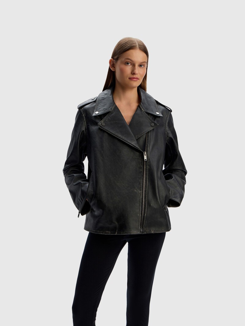 Прямая аккуратная куртка-косуха из плотной телячьей кожи, произведенной в Италии и вручную обработанной специальными щетками для придания винтажного эффекта. Чуть спущенное плечо, удобные вертикальные карманы, надежная фурнитура — в такой модели будет уютно, а образ благодаря небольшому наклону молнии получится лаконичным и женственным. На подкладке из поливискозы. Золотой статус LWG означает, что фабрика полностью отвечает требованиям к экологической безопасности процессов и химикатов, имеет все необходимые очистные сооружения и заботится о здоровье сотрудников. Сделано в Турции.
