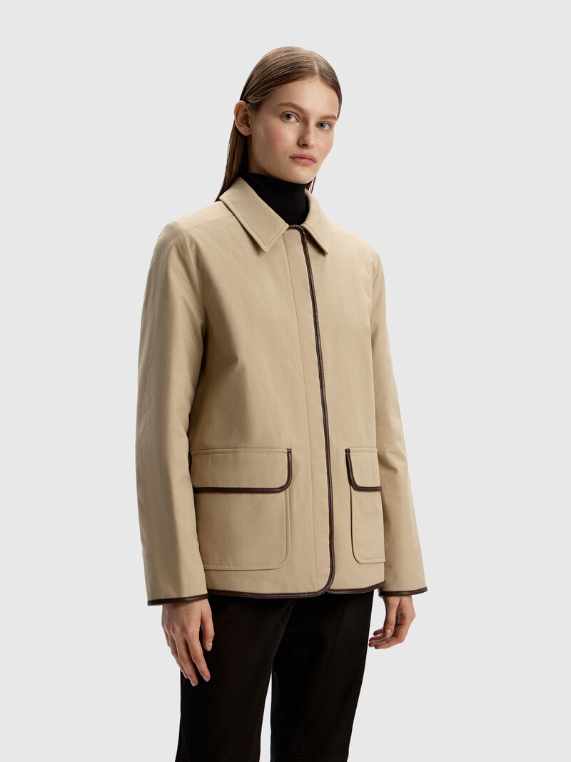 Легкая куртка, которую несложно включить в гардероб благодаря сходству с жакетом. Носите ее в сухую прохладную погоду: сочетание дышащего хлопка с тонким слоем воздушного утеплителя обеспечит комфортную температуру тела. Чтобы сделать модель более графичной, края куртки окантовали искусственной кожей. Сделано в России