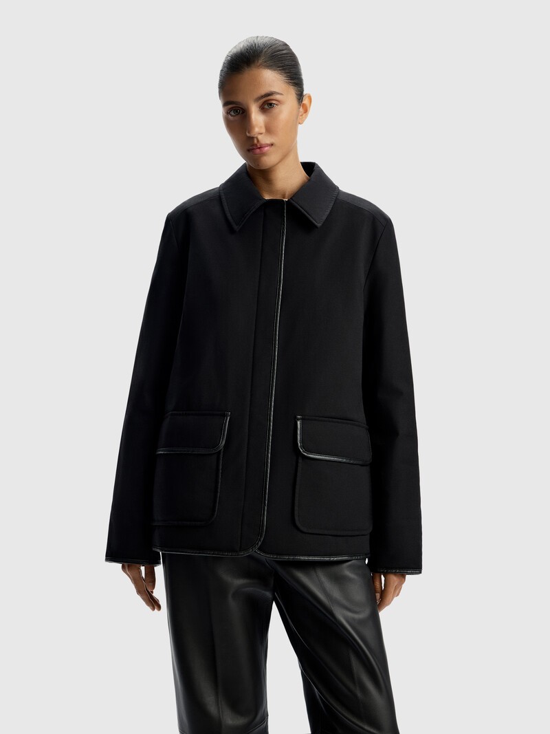 Легкая куртка, которую несложно включить в гардероб благодаря сходству с жакетом. Носите ее в сухую прохладную погоду: сочетание дышащего хлопка с тонким слоем воздушного утеплителя обеспечит комфортную температуру тела. Чтобы сделать модель более графичной, края куртки окантовали искусственной кожей. Сделано в России.