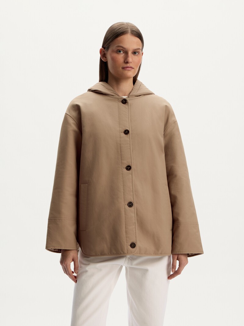 Лаконичную куртку можно стилизовать по-разному: съемная манишка с капюшоном придает ей более спортивный вид и помогает укрыть голову от ветра. Для куртки мы выбрали плотный дышащий хлопок с покрытием WR, защищающим от несильных осадков. Шелковистая подкладка простегана квадратами с тонким слоем синтепона, а края швов аккуратно окантованы косой бейкой. Сделано в Китае.